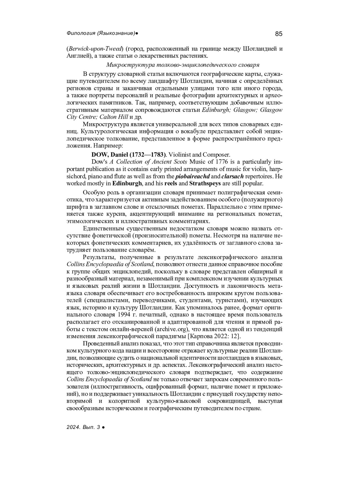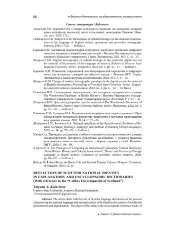 В статье анализируется роль справочников шотландского языка в процессе сохранения национального языка и национальной культуры Шотландии в условиях всемирной глобализации и цифровизации. Уникальный исторический опыт и реалии, которыми богата Шотландия, находят своё проявление в шотландском языке, традиция описания которого ведется английской лексикографией с прикнижных глоссариев. В этой связи проводится лексикографический анализ авторитетной энциклопедии для общих целей. Рассматривается вопрос о предпосылках возникновения лексикографической традиции в Шотландии на примере словарей языка писателей как источника культурно-языкового авторитета. Поднимается вопрос о современных тенденциях разработки структуры словарей и справочников шотландского языка в контексте антропоцентрической направленности научных исследований, целью которой является удовлетворение запросов и нужд пользователей. Отмечается возрастающая роль экстралингвистической информации источника, наличие которой расширяет группу целевой аудитории: в ее спектр входят переводчики, специалисты, студенты, туристы и др