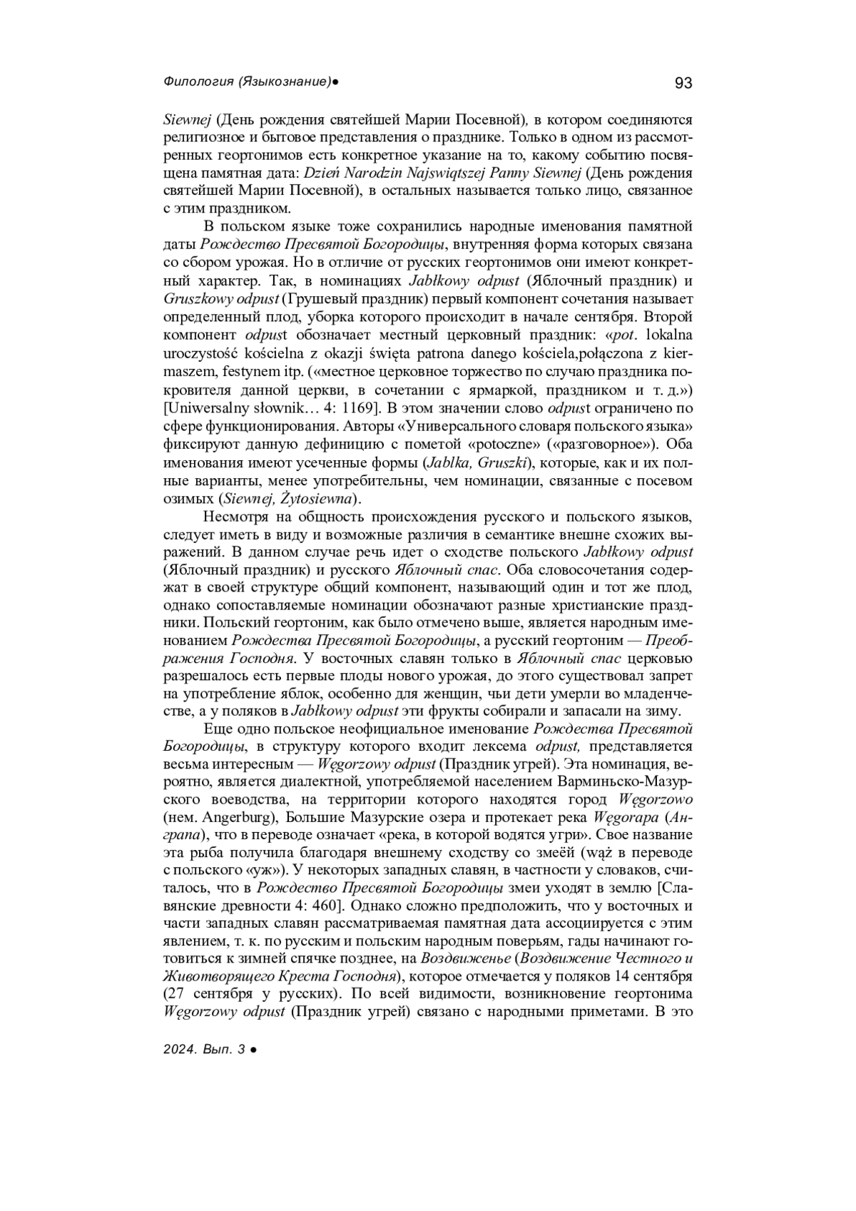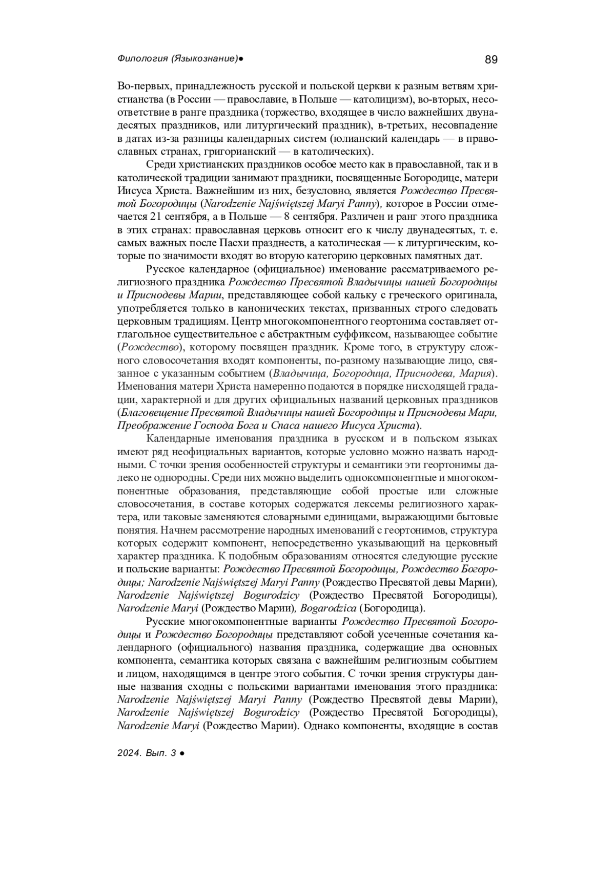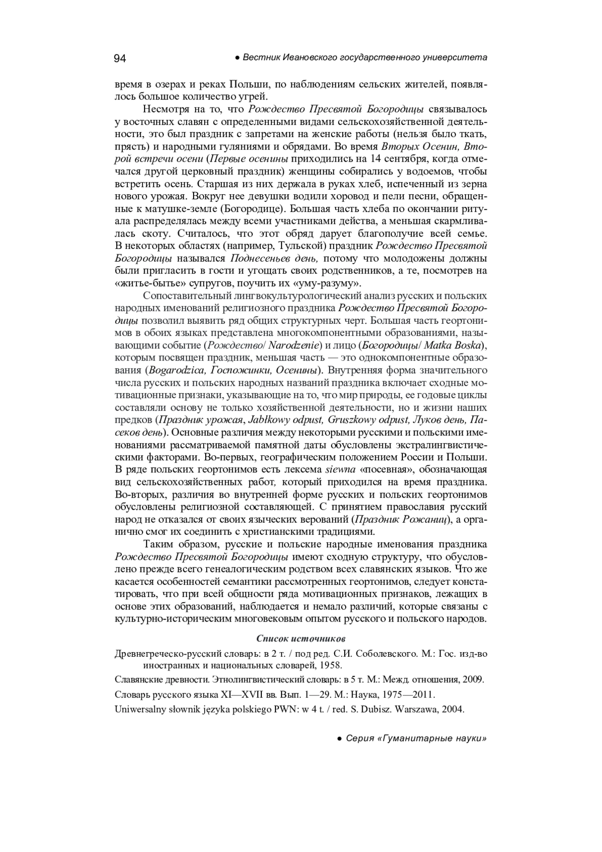 В статье рассматриваются русские и польские народные именования христианского праздника Рождество Пресвятой Богородицы. С целью обнаружения лингвокультурологической специфики данных образований анализируются структурные и семантические особенности общеупотребительных и территориально ограниченных наименований этой памятной даты. На основе компонентного анализа устанавливается, что значительное число русских и польских народных именований характеризуется сходством состава и внутренней формы. Общие мотивационные признаки, лежащие в основе этих номинаций, указывают на лицо и событие, которому посвящен праздник. В результате сопоставительного анализа русских и польских диалектных названий праздника Рождество Пресвятой Богородицы были установлены различия в их семантике, обусловленные экстралингвистическими причинами. Различия в мотивации территориально ограниченных вариантов именования рассматриваемой памятной даты связаны с духовными и культурно-историческими традициями русского и польского народов