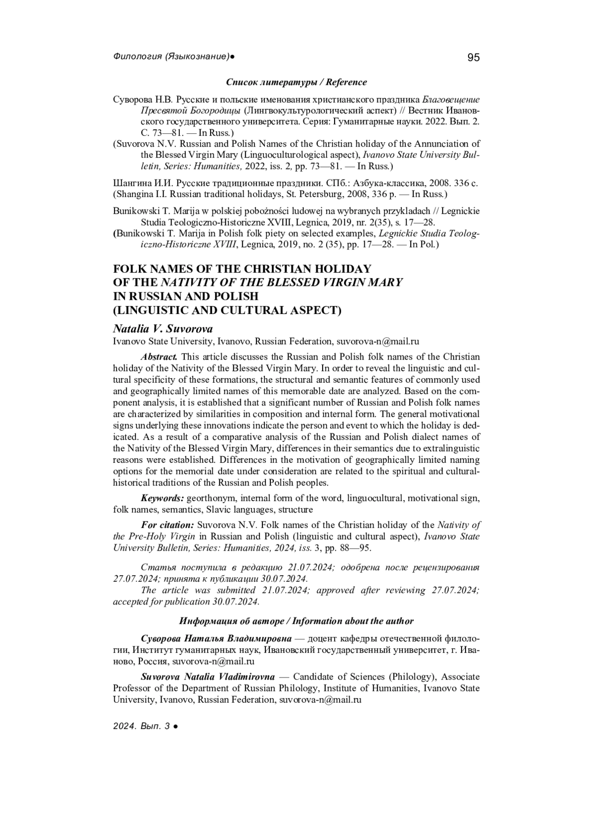 Suvorova N.V.Russian and Polish Names of the Christian holiday of the Annunciation of the Blessed Virgin Mary (Linguoculturological aspect), Ivanovo State University Bulletin, Series: Humanities, 2022, iss. 2, pp. 73-81. - In Russ.