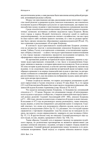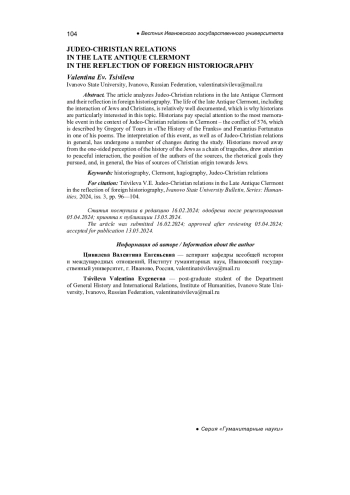 В статье анализируются иудео-христианские отношения в позднеантичном Клермоне и их отражение в зарубежной историографии. Жизнь позднеантичного Клермона, в том числе взаимодействие иудеев и христиан, относительно хорошо документированы, с чем связан особый интерес историков к этой теме. Особое внимание историков привлекает самое памятное событие в контексте иудео-христианских взаимоотношений в Клермоне — конфликт 576 г., о котором рассказывает Григорий Турский в «Истории франков» и Венанций Фортунат в одной из своих поэм. Интерпретация этого события, как и иудео-христианских взаимоотношений в целом, за время изучения претерпела ряд изменений. Историки отошли от одностороннего восприятия истории иудеев в христианском окружении как цепочки трагедий, обратили внимание на мирное взаимодействие иудеев и христиан, на позицию авторов источников, риторические цели, которые они преследовали, и в целом на тенденциозность источников христианского происхождения по отношению к иудеям