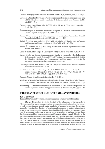 Статья посвящена изучению городского пространства позднесредневекового Альби в топографическом, архитектурном, политическом, экономическом и символическом измерениях. Предпринимается попытка рассмотрения городского пространства с позиций исторической психологии. На сегодняшний день данный подход, предполагающий изучение психологических феноменов применительно к городу и пространству, является одним из наиболее актуальных направлений современной исторической урбанистики. В особенности в этом отношении можно отметить увеличение интереса среди исследователей к средневековой истории. Таким образом, выбранная методология определяет научную новизну исследования. Целью работы является установление связи между физическим и символическим пространством, между горожанами и местом их обитания, а также изучение взаимовлияния пространства и социальной психологии. Устанавливается круг исторических источников, который включает в себя архитектурные, письменные, сфрагистические, геральдические и картографические типы, представленные как опубликованными, так и неопубликованными архивными материалами, а также сохранившими объектами монументальной архитектуры Позднего Средневековья, расположенными на территории города. Определяются возможности для изучения идентичности горожан в их связи с пространством на уровне индивида, института, квартала и городского сообщества как единого целого