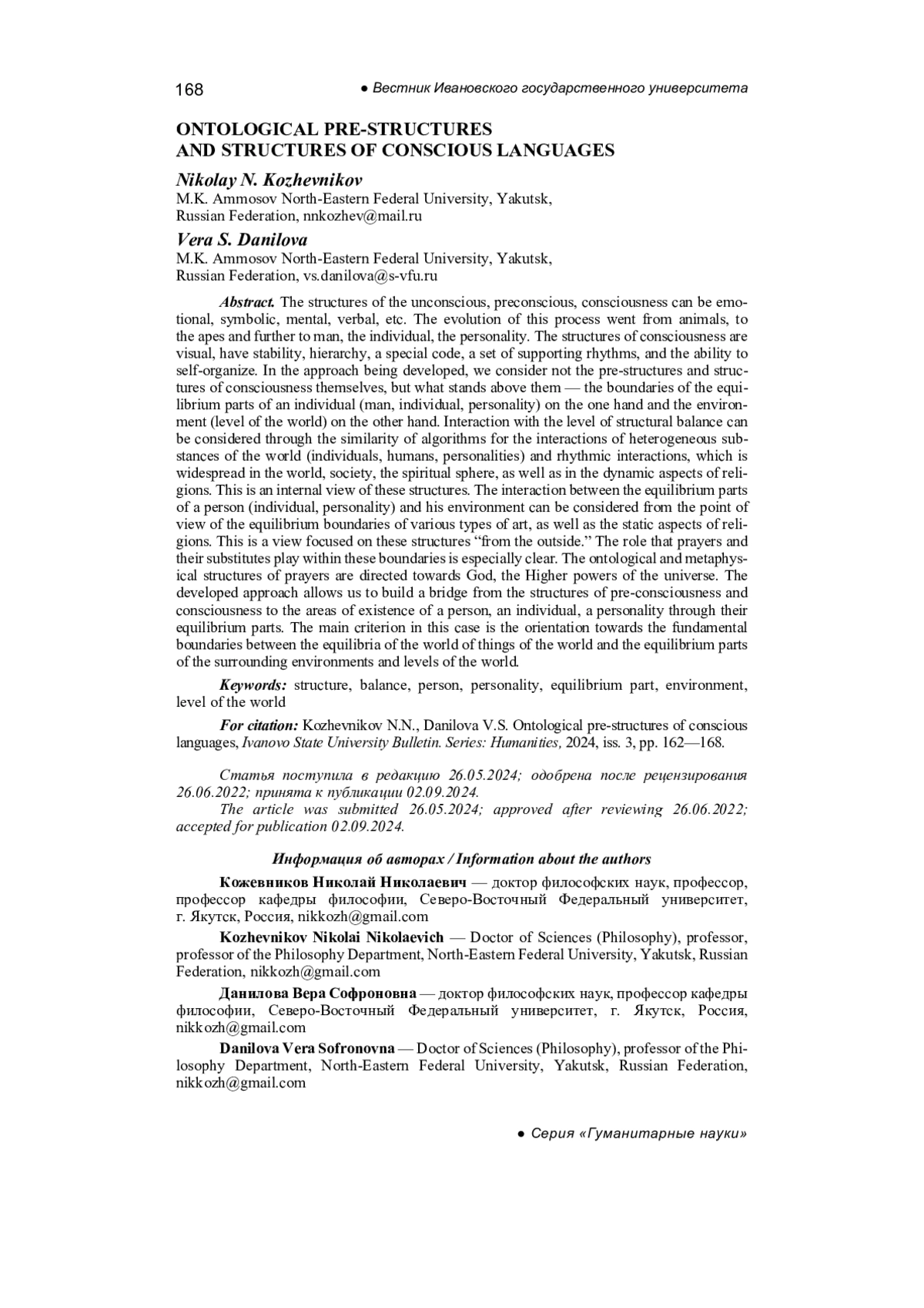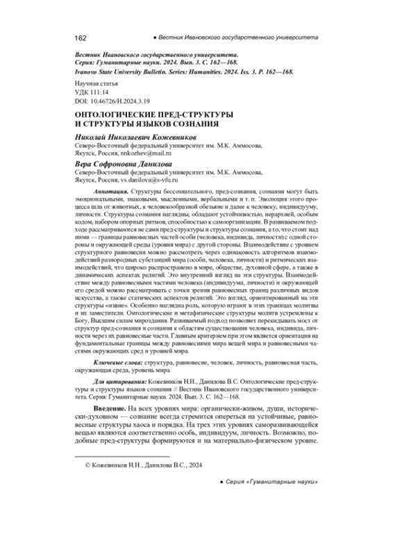 КОЖЕВНИКОВ Н. Н., ДАНИЛОВА В. С. ОНТОЛОГИЧЕСКИЕ ПРЕД-СТРУКТУРЫ И СТРУКТУРЫ ЯЗЫКОВ СОЗНАНИЯ // ВЕСТНИК ИВАНОВСКОГО ГОСУДАРСТВЕННОГО УНИВЕРСИТЕТА. СЕРИЯ: ГУМАНИТАРНЫЕ НАУКИ. 2024. № 3