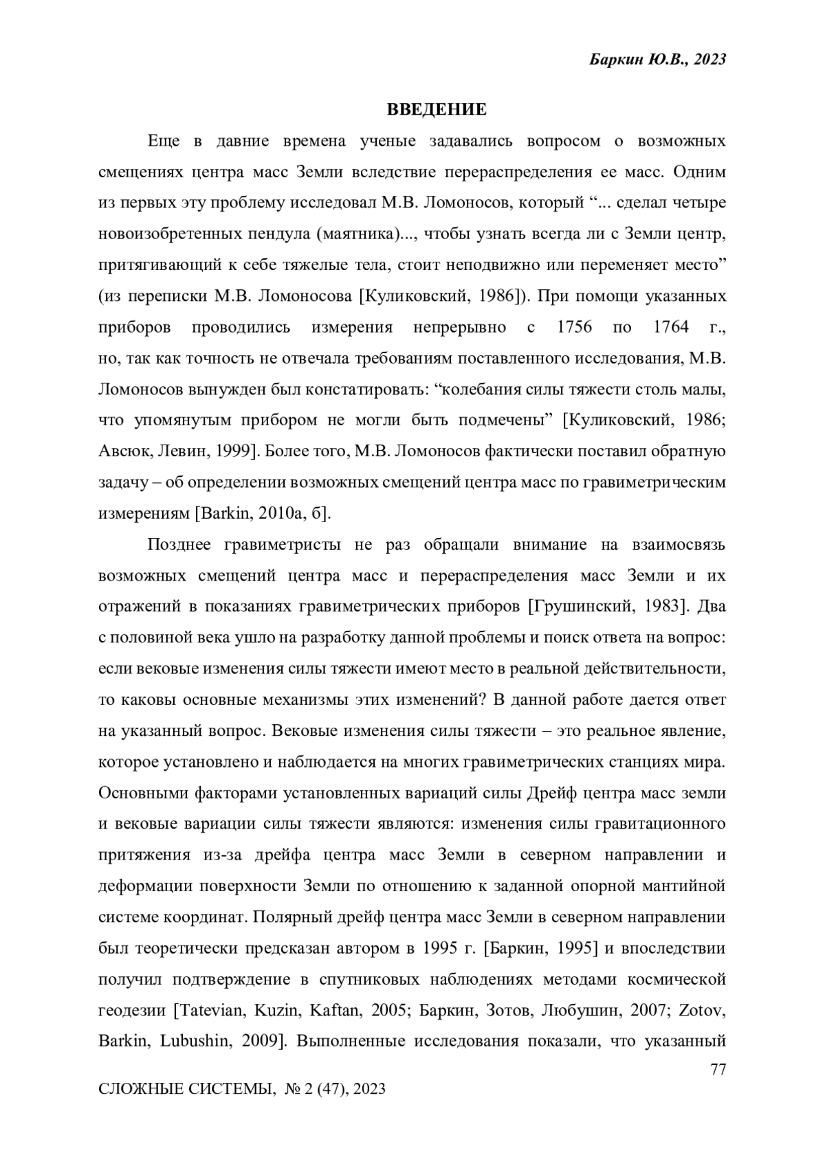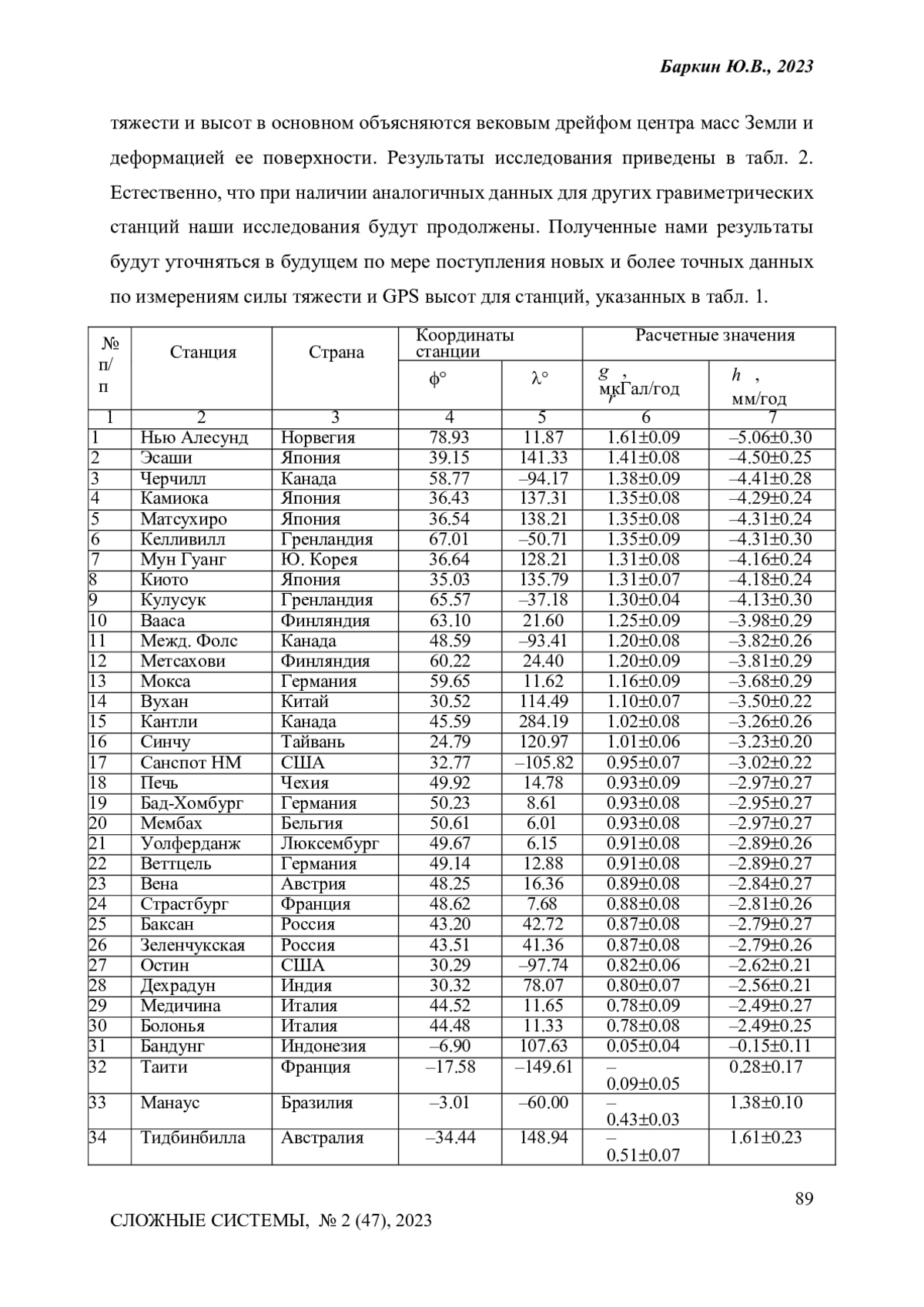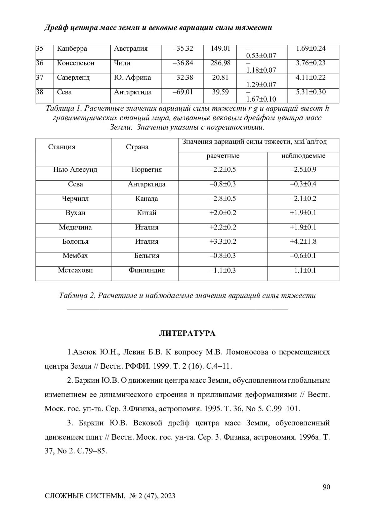 Показано, что вековое смещение центра масс Земли (дрейф), наблюдаемое методами космической геодезии, и деформация поверхности Земли дают наиболее значительные вклады в вековые изменения силы тяжести на поверхности Земли, которые фиксируются с помощью абсолютных и сверхпроводящих гравиметров. Простейшие оценки векового изменения силы тяжести на данной станции могут быть сделаны непосредственно по вековой вариации высоты станции, определенной по спутниковым данным GPS наблюдений. Эти данные определяют тренд станции непосредственно по отношению к дрейфующему центру масс Земли. Однако, они не позволяют оценить вклады указанных выше эффектов: дрейфа центра масс и изменения высоты станции из-за деформации, а фактически определяют их разность. Выполненный анализ позволил оценить вклад дрейфа центра масс Земли в вариации силы тяжести на данной гравиметрической станции, а также вклад деформации поверхности Земли и соответствующего изменения высоты станции. Для 8 известных и ведущих гравиметрических станций указанные составляющие вариаций силы тяжести были вычислены. Было показано, что указанные два фактора являются основными, а их сумма в основном объясняет наблюдаемые в настоящее время вариации силы тяжести на ряде известных гравиметрических станций: Нью Алесунд (Норвегия), Сева (Антарктида), Черчилл (Канада), Вухан (Китай), Медичина (Италия), Болонья (Италия), Мембах (Бельгия) и Метсахови (Финляндия).