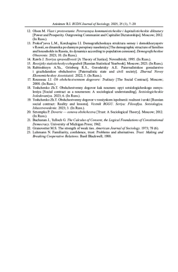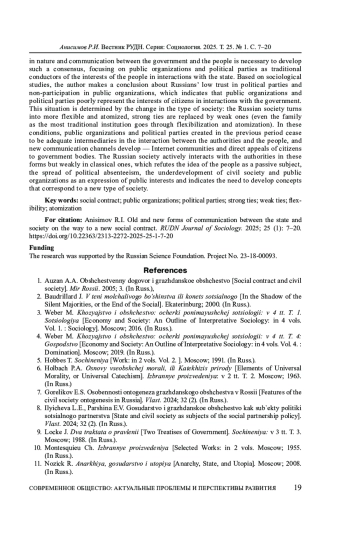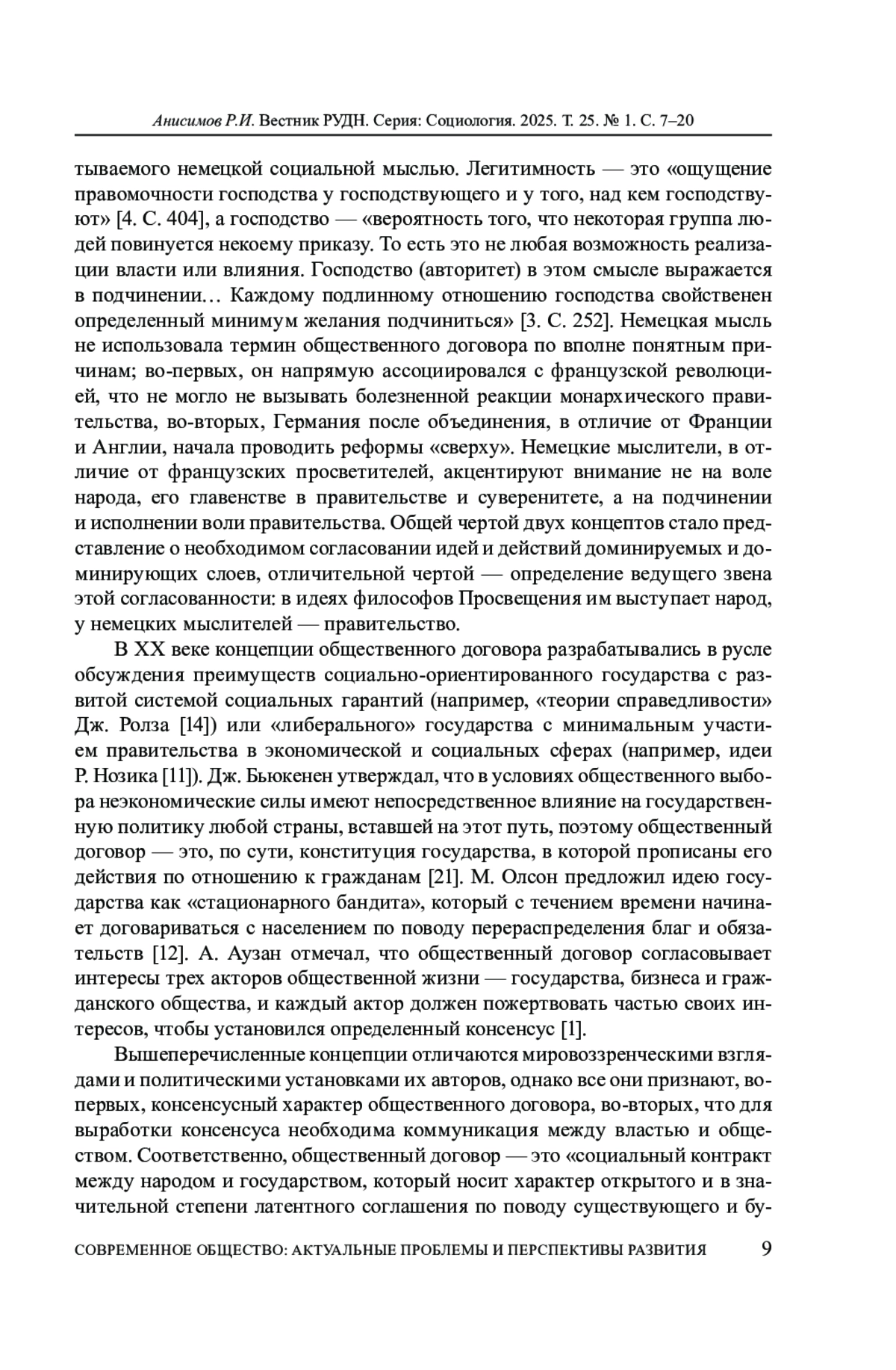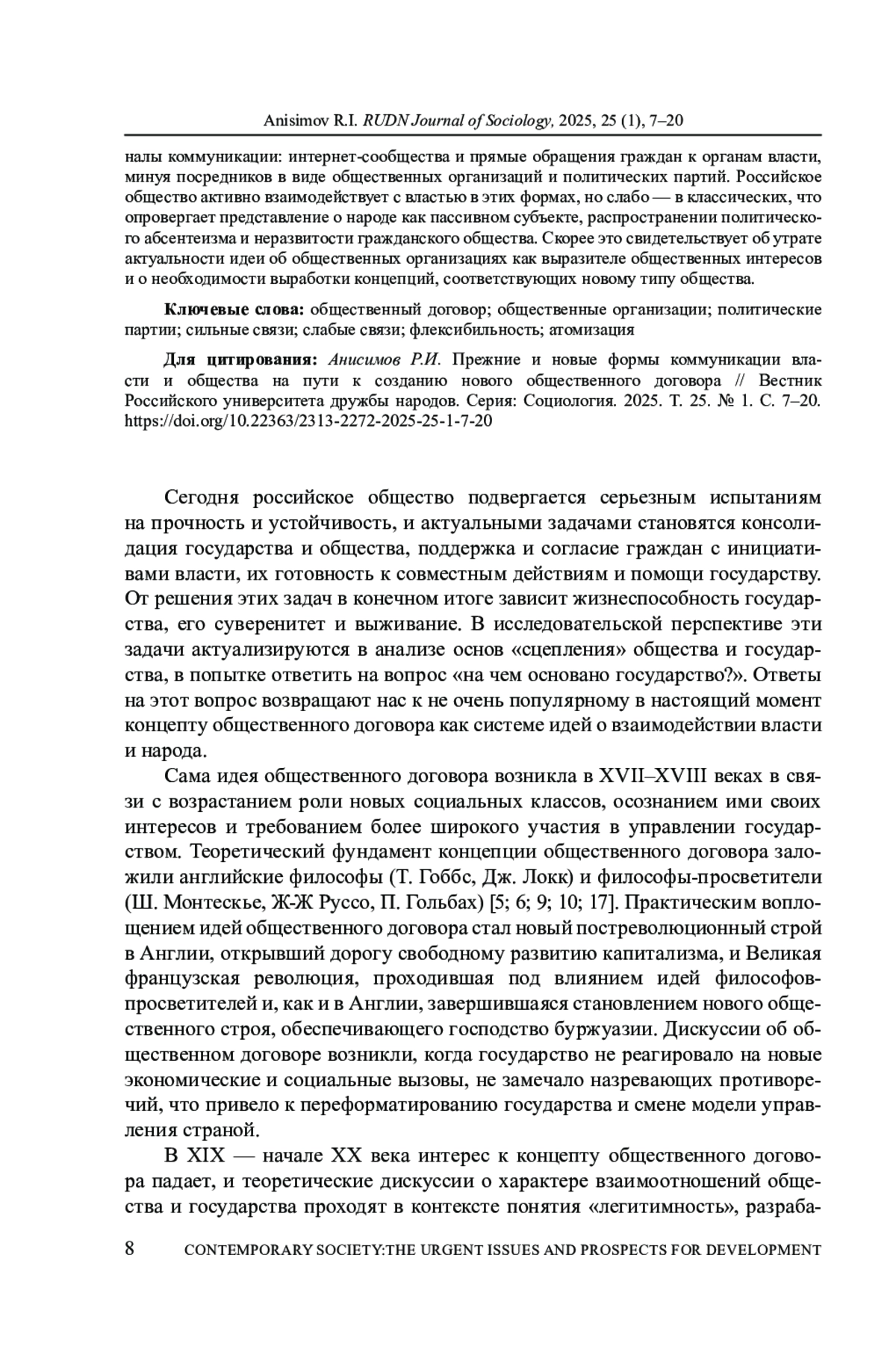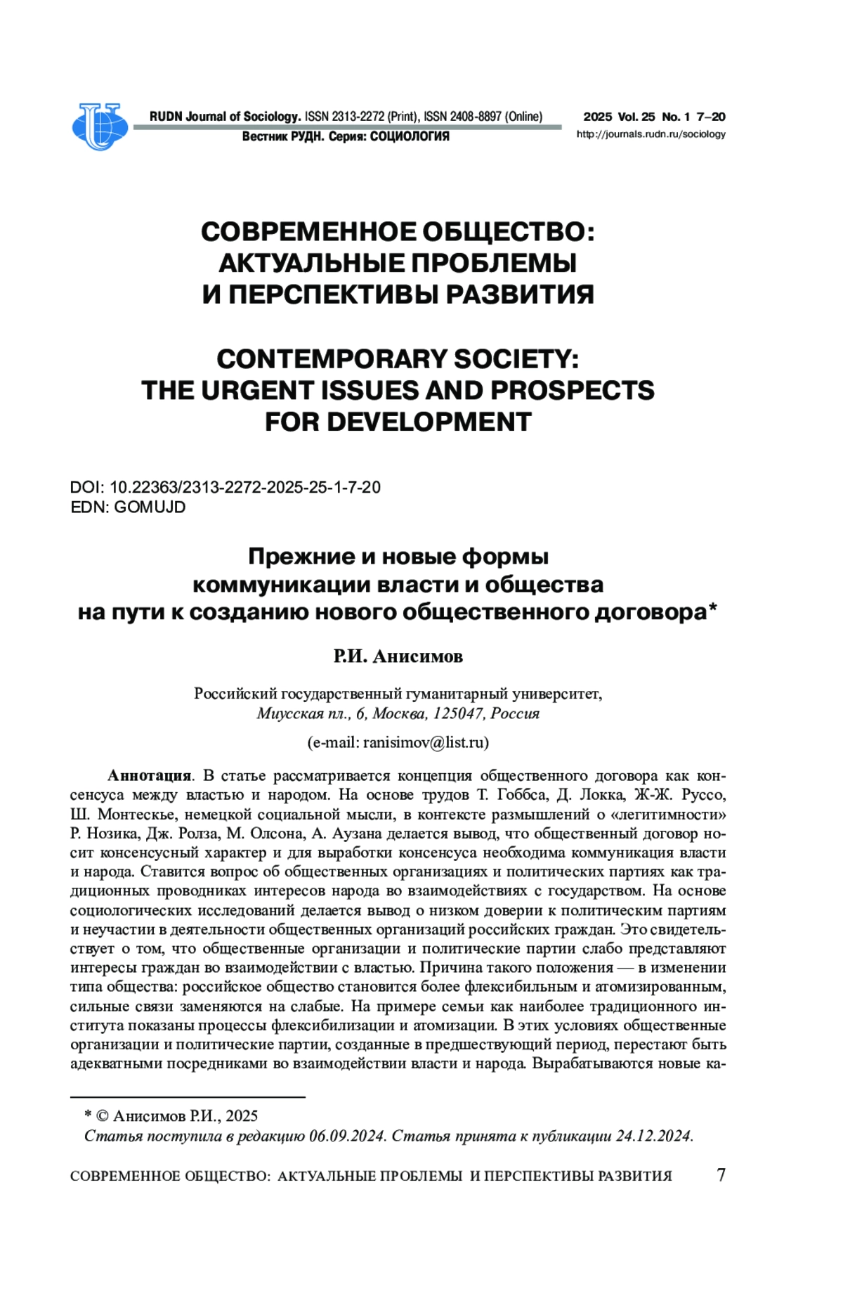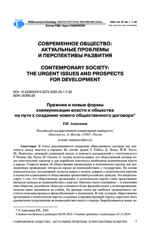 АНИСИМОВ Р. И. ПРЕЖНИЕ И НОВЫЕ ФОРМЫ КОММУНИКАЦИИ ВЛАСТИ И ОБЩЕСТВА НА ПУТИ К СОЗДАНИЮ НОВОГО ОБЩЕСТВЕННОГО ДОГОВОРА // ВЕСТНИК РОССИЙСКОГО УНИВЕРСИТЕТА ДРУЖБЫ НАРОДОВ. СЕРИЯ: СОЦИОЛОГИЯ. 2025. Т. 25 № 1