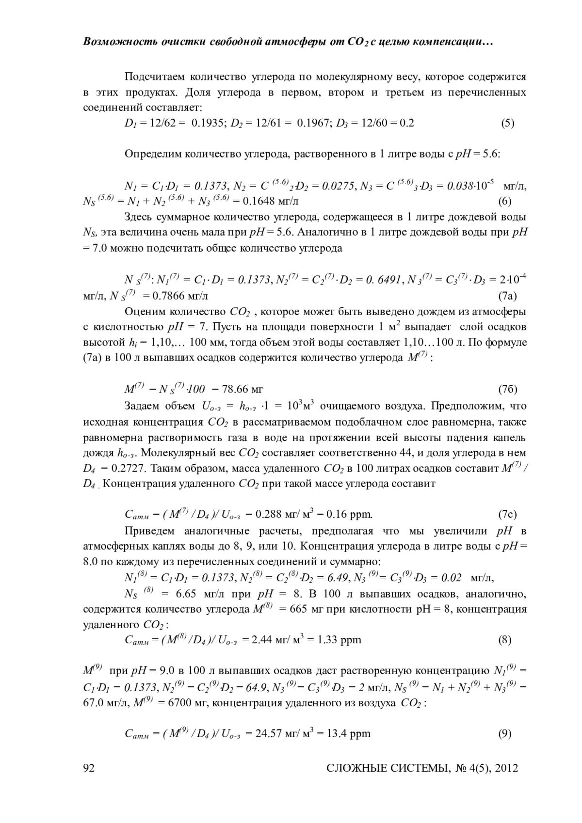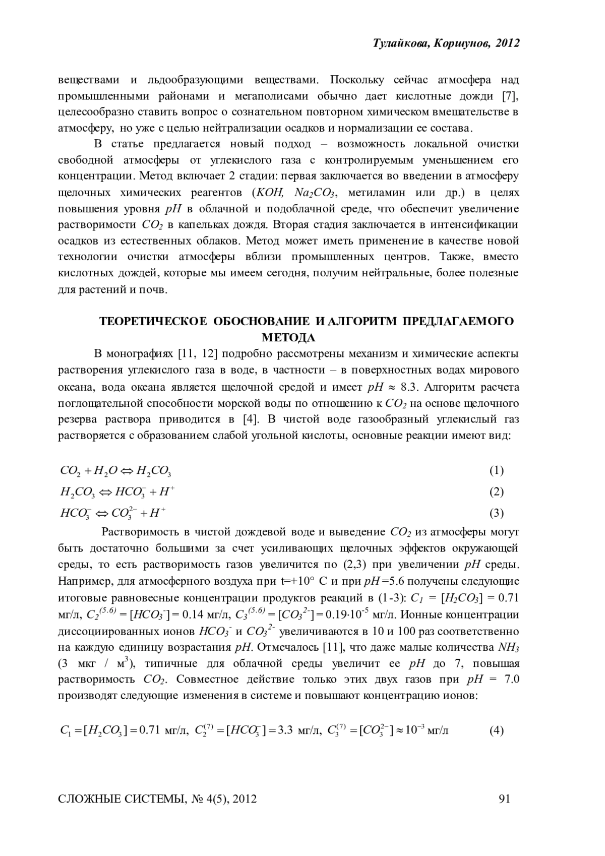 Предложен метод очистки отдельных участков свободной атмосферы от избытка СО 2, искусственно повышая до необходимого уровень pH в облаках с последующей интенсификацией осадков из естественных облаков с целью осаждать из атмосферы расчетное количество углерода. Предложенный метод, при применении на 10% поверхности Земли, способен компенсировать ежегодный промышленный выброс СО2. Метод требует детализации и развития, для проведения активных воздействий на облака, необходим их космический мониторинг с указанием параметров