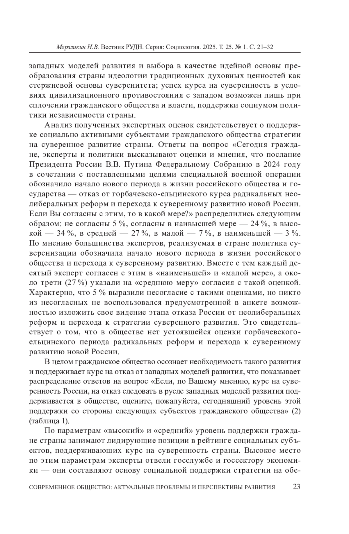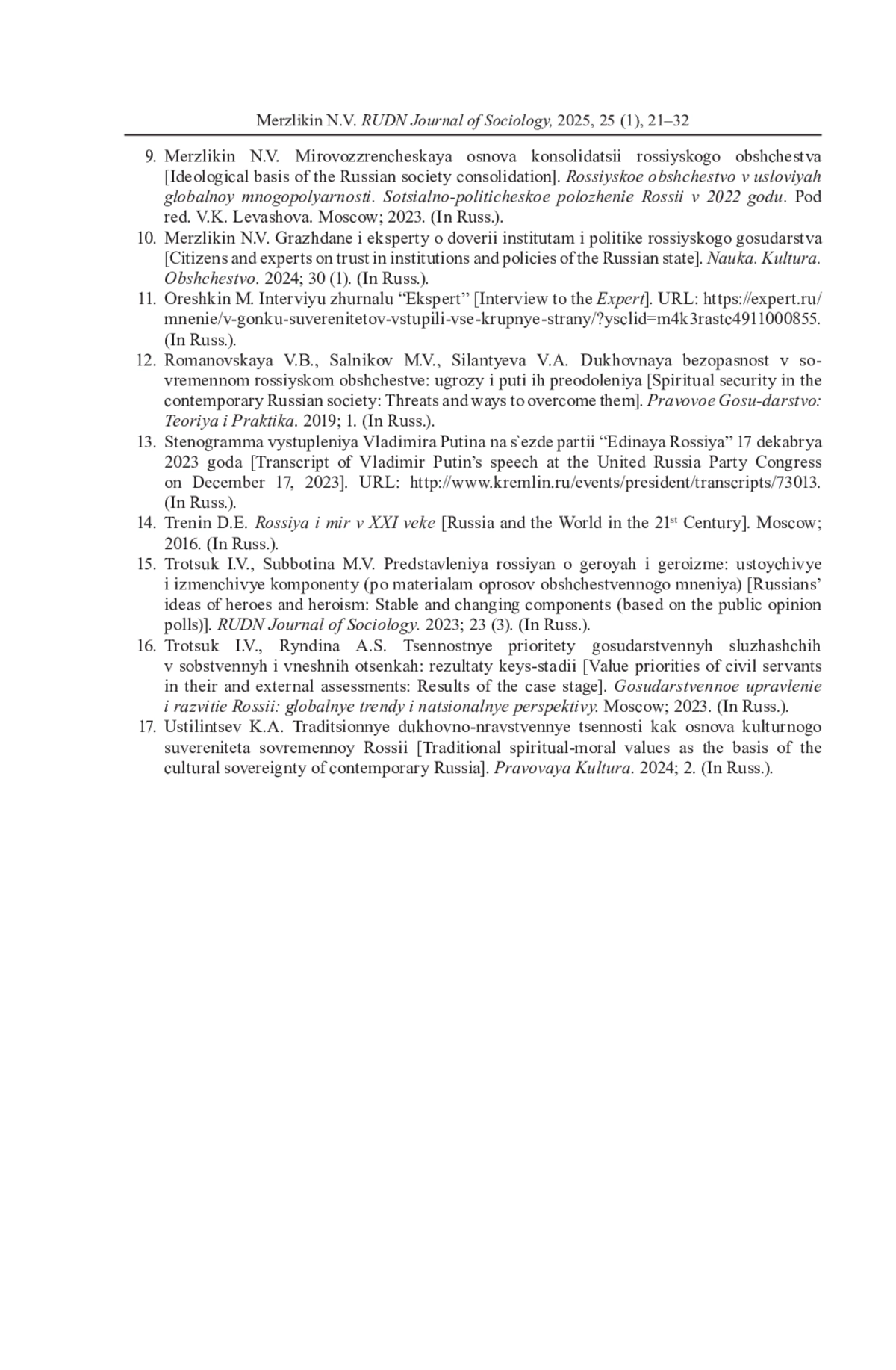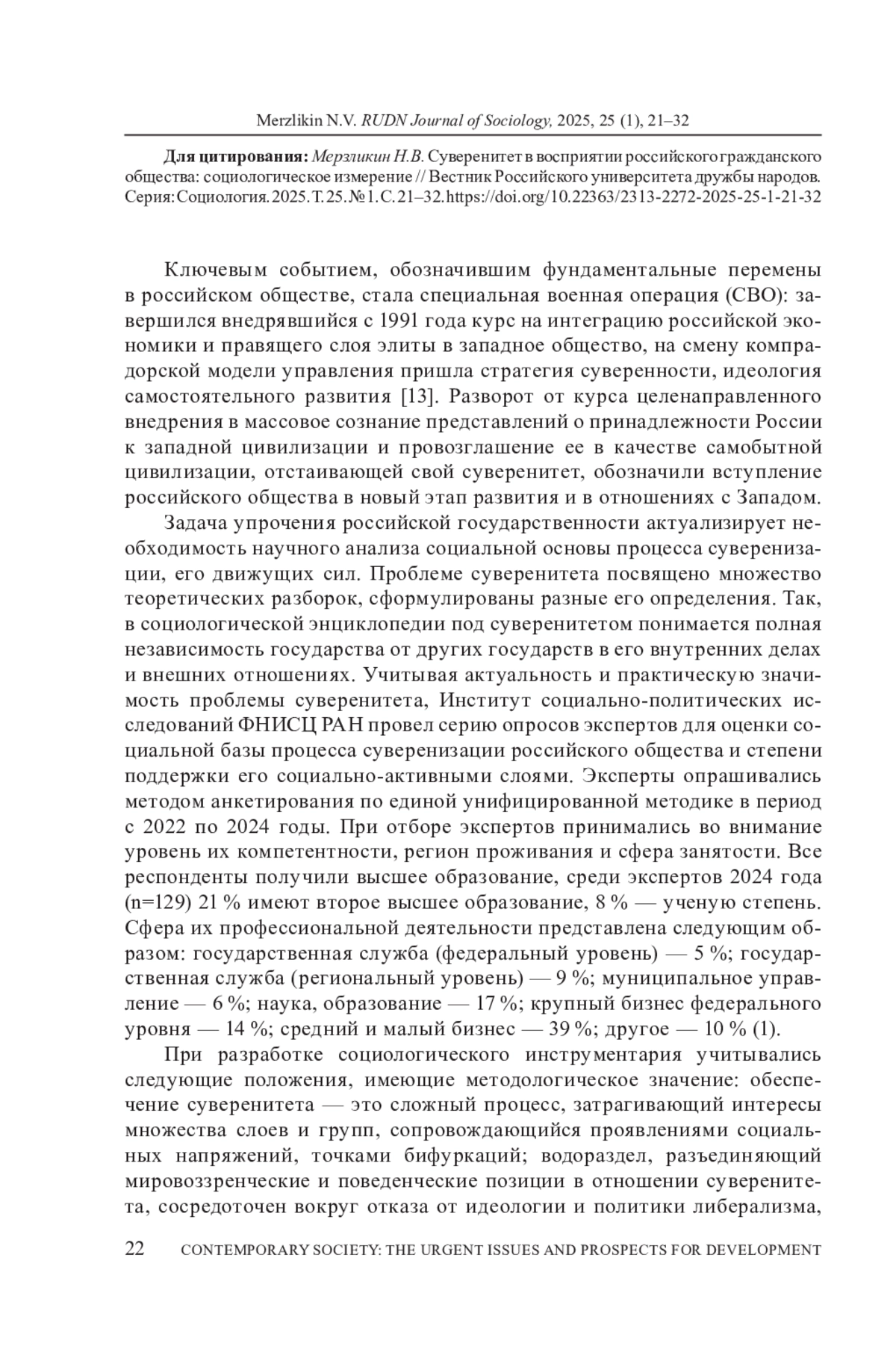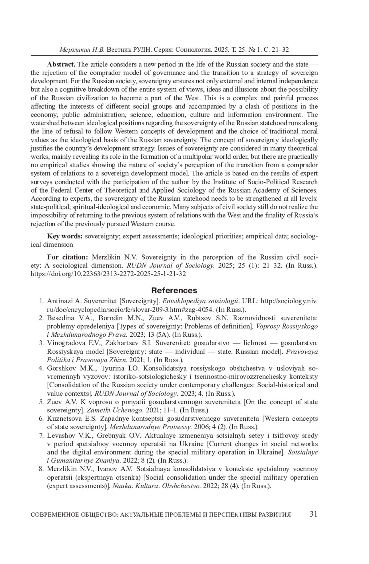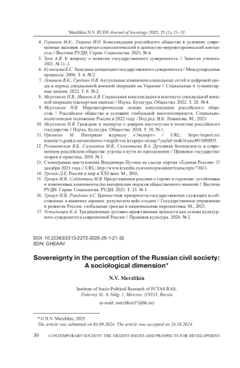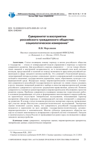 МЕРЗЛИКИН Н. В. СУВЕРЕНИТЕТ В ВОСПРИЯТИИ РОССИЙСКОГО ГРАЖДАНСКОГО ОБЩЕСТВА: СОЦИОЛОГИЧЕСКОЕ ИЗМЕРЕНИЕ // ВЕСТНИК РОССИЙСКОГО УНИВЕРСИТЕТА ДРУЖБЫ НАРОДОВ. СЕРИЯ: СОЦИОЛОГИЯ. 2025. Т. 25 № 1