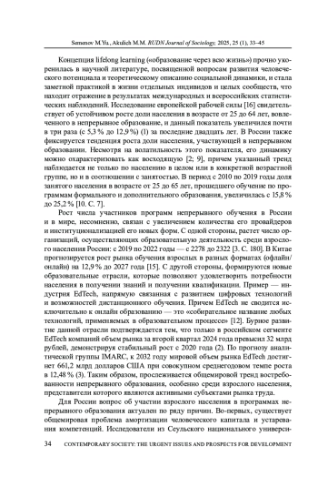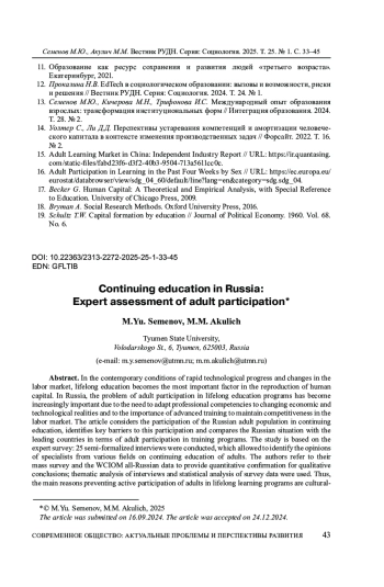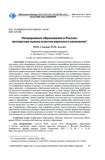 В современных условиях быстрого технологического прогресса и изменения рынка труда непрерывное образование становится важнейшим фактором воспроизводства человеческого капитала. В России проблема участия взрослого населения в программах непрерывного образования обретает все большую значимость, что связано с необходимостью адаптации профессиональных компетенций к изменяющимся экономическим и технологическим реалиям, а также с важностью повышения квалификации для поддержания конкурентоспособности на рынке труда. Статья посвящена участию взрослого населения России в непрерывном образовании, выявлению ключевых барьеров, препятствующих данному участию, и сравнению российской ситуации с лидирующими странами по уровню вовлеченности взрослых в программы обучения. Исследование основано на экспертном опросе: было проведено 25 полуформализованных интервью, что позволило выявить мнения специалистов из разных сфер, связанных с непрерывным образованием взрослых. Дополнительно были использованы результаты авторского массового анкетирования, а также данные опросов ВЦИОМ, что обеспечило количественное подтверждение качественных выводов. Применялся тематический анализ интервью и статистическая обработка данных анкетирования. Анализ показал, что основные причины, препятствующие активному участию взрослых в программах непрерывного образования, - культурно-ценностные установки, финансовые ограничения и недостатки институциональной среды. Несмотря на рост интереса к дополнительному обучению, Россия продолжает отставать от стран-лидеров по уровню включенности взрослого населения в непрерывное образование. Для повышения уровня участия взрослых в непрерывном образовании необходимо развивать образовательную культуру, снижать финансовые барьеры и совершенствовать институциональные условия. Эти меры будут способствовать повышению конкурентоспособности рабочей силы и развитию человеческого капитала страны.