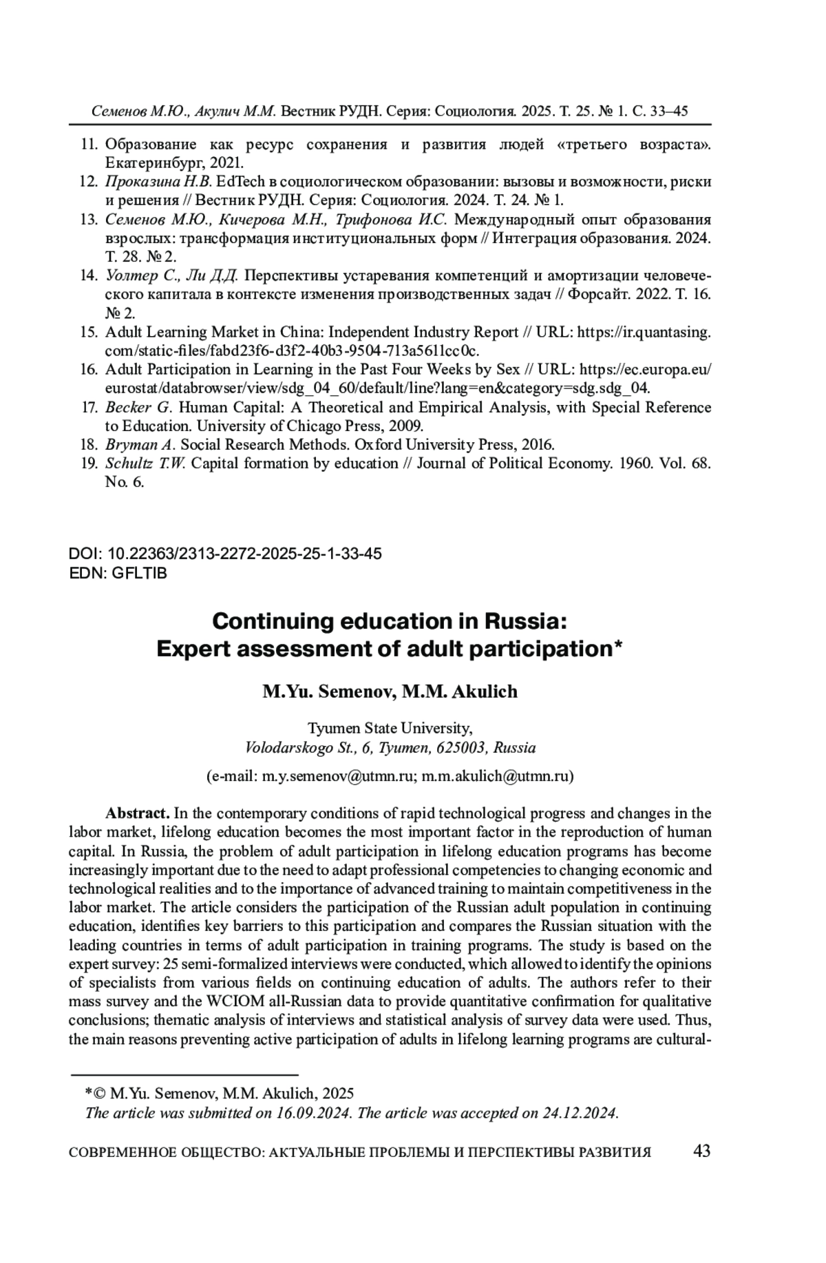 13. Семенов М.Ю., Кичерова М.Н., Трифонова И.С. Международный опыт образования взрослых: трансформация институциональных форм // Интеграция образования. 2024. Т. 28. № 2. EDN: NDGJGM