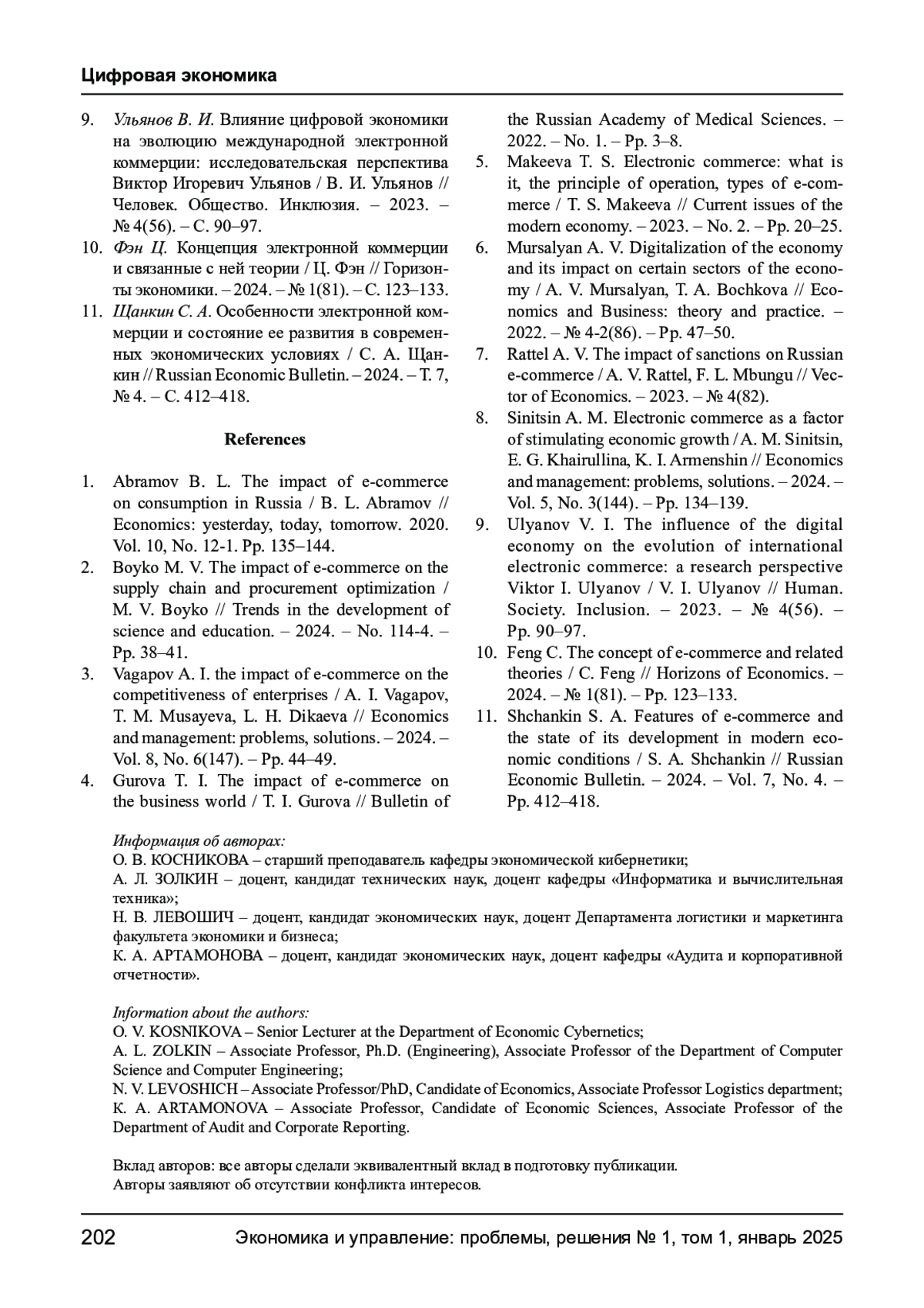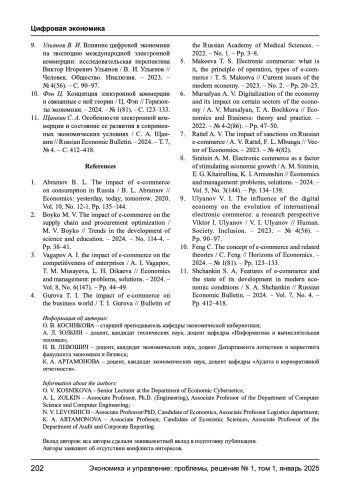 1. Абрамов Б. Л. Влияние электронной коммерции на потребление в России / Б. Л. Абрамов // Экономика: вчера, сегодня, завтра. - 2020. - Т. 10, № 12-1. - С. 135-144. EDN: ZNCHKP