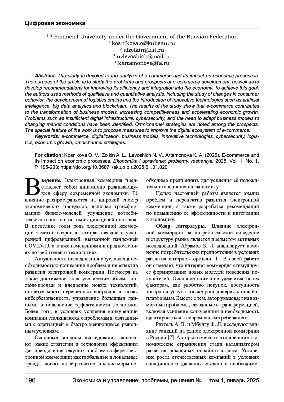 Исследование посвящено анализу электронной коммерции и её воздействия на экономические процессы. Цель статьи заключается в изучении проблем и перспектив развития электронной коммерции, а также разработке рекомендаций по повышению её эффективности и интеграции в экономику. Для достижения цели авторы использовали методы качественного и количественного анализа, включая изучение изменений в поведении потребителей, развитие логистических цепей и внедрение таких инновационных технологий, как искусственный интеллект, аналитика больших данных и блокчейн. Результаты исследования показывают, что электронная коммерция способствует трансформации бизнес-моделей, повышению конкурентоспособности и ускорению экономического роста. Выявлены такие проблемы, как недостаточная цифровая инфраструктура, кибербезопасность и необходимость адаптации бизнес-моделей к изменяющимся рыночным условиям. Среди перспектив отмечаются омниканальные стратегии. Особенность работы заключается в предложении мер по улучшению цифровой экосистемы электронной коммерции.