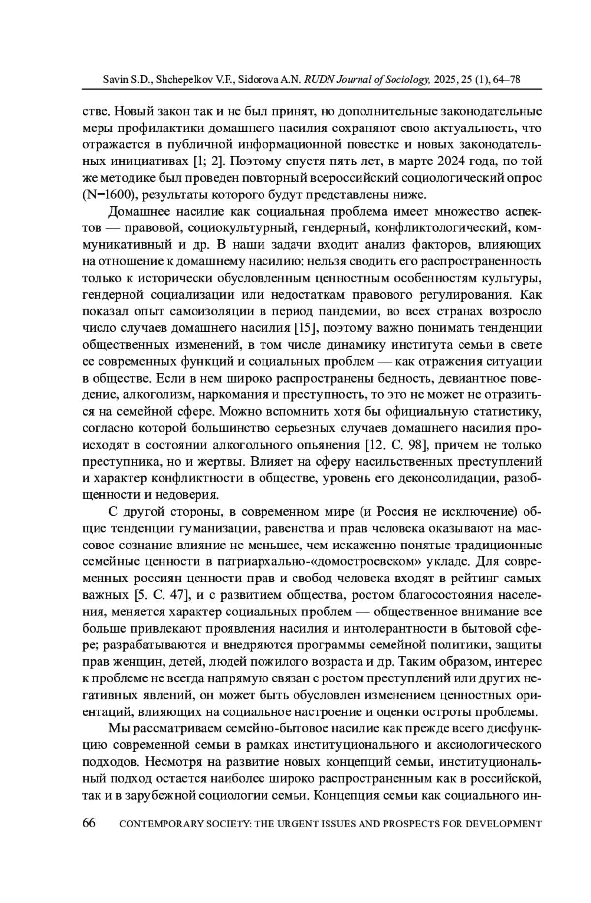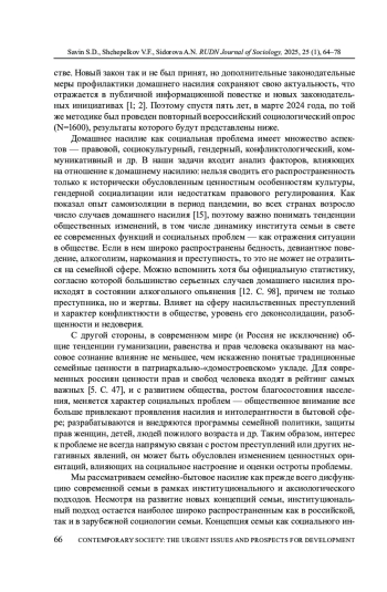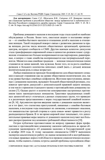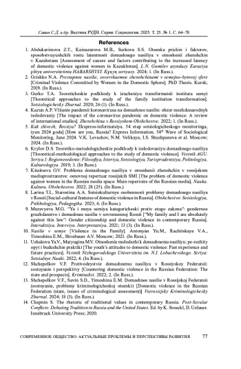 8. Ларина Т.И., Старостина А.А. Социокультурные особенности проблемы домашнего насилия в России // Общество: социология, психология, педагогика. 2023. № 6. EDN: XBDGUT
