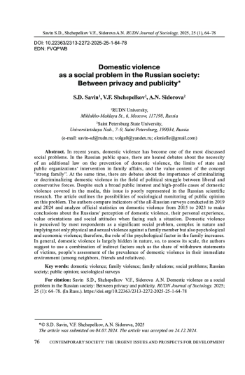 В последние годы домашнее насилие стало одной из наиболее обсуждаемых социальных проблем. В российском публичном пространстве идут жаркие споры о том, необходим или нет дополнительный закон о профилактике домашнего насилия, о границах вмешательства государства и общественных организаций в дела семьи, о ценностном содержании понятия «крепкая семья». При этом споры о важности криминализации или декриминализации семейного насилия проникают и в политическую плоскость борьбы либеральных и консервативных сил. Несмотря на столь широкий общественный интерес и резонансные случаи домашнего насилия, освещенные в СМИ, эта проблематика крайне скупо представлена в российском научно-исследовательском поле. В статье обозначены возможности социологического мониторинга общественного мнения по данной проблеме. Сравниваются показатели всероссийских опросов, проведенных авторами в 2019 и 2024 годы, анализируются данные официальной статистики семейного насилия за период 2015-2023 годов. Делаются выводы о характере восприятия россиянами домашнего насилия, их личном опыте, ценностных ориентациях и социальных установках при столкновении с подобной ситуацией. Домашнее насилие воспринимается большинством опрошенных как значимая социальная проблема, комплексная по характеру. Россияне относят к нему не только физическое и сексуальное насилие в отношении члена семьи, но также психологическое и экономическое насилие, причем роль психологического фактора в семье возрастает. В целом домашнее насилие носит во многом скрытый характер, поэтому оценка его масштабов требует учета косвенных факторов его появления, таких как доля отозванных заявлений потерпевших, оценка распространенности домашнего насилия в ближнем окружении (среди соседей, друзей и родственников).
