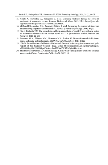 15. Kourti A., Stavridou A., Panagouli E. et al. Domestic violence during the covid-19 pandemic: A systematic review // Trauma, Violence & Abuse. 2021 // URL: https://journals.sagepub.com/doi/pdf/. DOI: 10.1177/15248380211038690 EDN: ZVGMTW