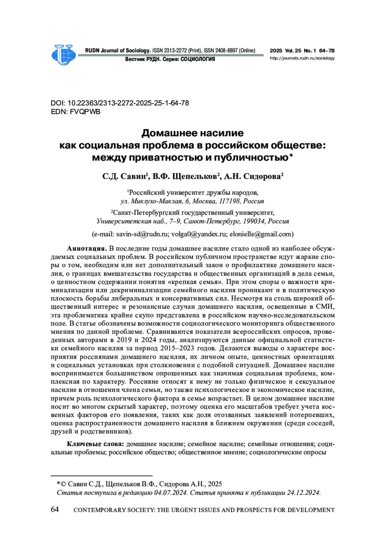 13. Щепельков В.Ф., Савин С.Д., Тимошина Е.М. Домашнее насилие в Российской Федерации (состояние, проблемы криминологической оценки) // Всероссийский криминологический журнал. 2024. Т. 18. № 3. EDN: WQSUQL