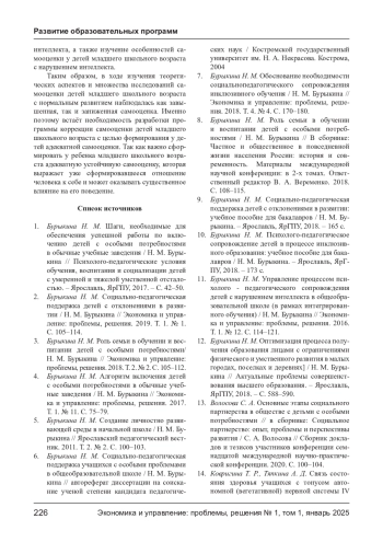 4. Бурыкина Н. М. Алгоритм включения детей с особыми потребностями в обычные учебные заведения / Н. М. Бурыкина // Экономика и управление: проблемы, решения. 2017. Т. 1. № 11. С. 75-79. EDN: ZVNCUD