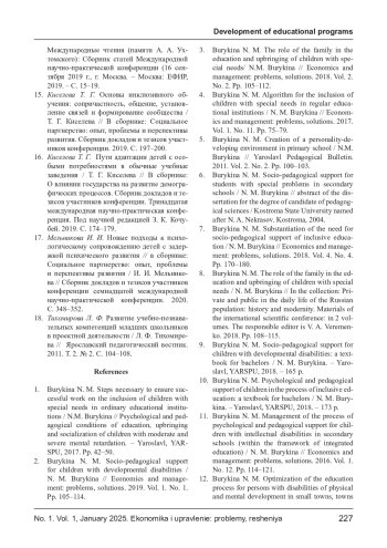 12. Бурыкина Н. М. Оптимизация процесса получения образования лицами с ограничениями физического и умственного развития в малых городах, поселках и деревнях] / Н. М. Бурыкина // Актуальные проблемы совершенствования высшего образования. - Ярославль, ЯрГПУ, 2018. - С. 588-590. EDN: YWDSNR