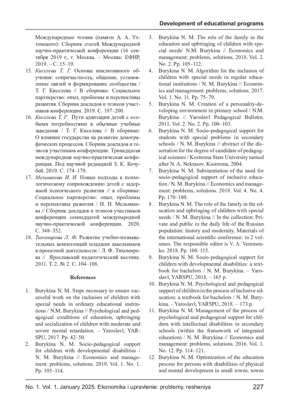 2. Бурыкина Н. М. Социально-педагогическая поддержка детей с отклонениями в развитии / Н. М. Бурыкина // Экономика и управление: проблемы, решения. 2019. Т. 1. № 1. С. 105-114. EDN: YYFWLZ