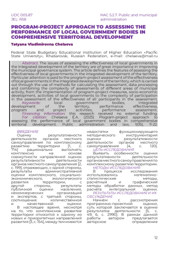 Вопросы оценки результативности деятельности органов местного самоуправления по комплексному развитию территории имеют большое значение в совершенствовании системы муниципального управления. В статье определены особенности оценки результативности деятельности органов местного самоуправления по комплексному развитию территории. Особое внимание уделяется программно-проектной оценке результативности деятельности органов местного самоуправления по комплексному развитию территории, которая выполнена посредством применения методов расчёта оценки, обработки данных и сочетания комплексности оценок разных направлений деятельности муниципалитета, от реализации программно-проектных мероприятий, социально-экономического развития, деятельности органов местного самоуправления до комплексности участия в оценке результативности всех участников оценки.