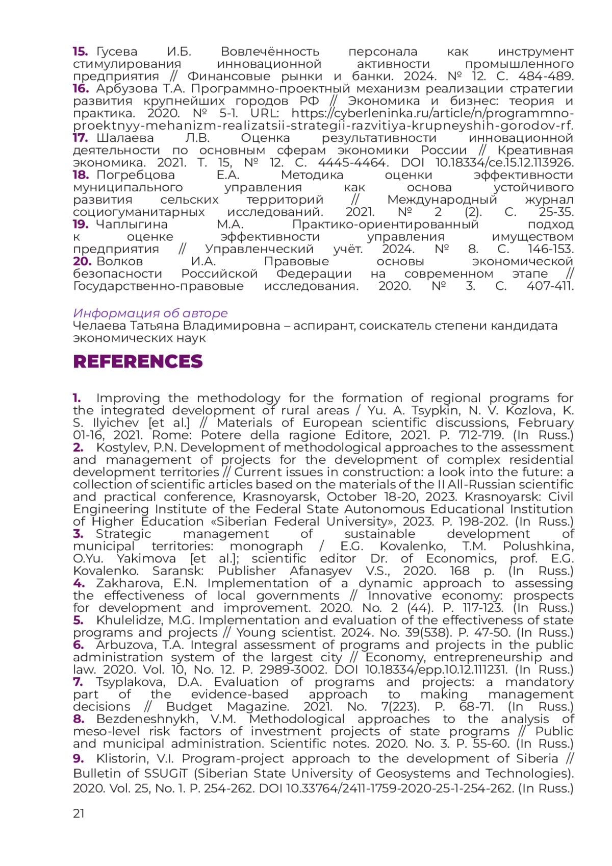 39. Chaplygina, M.A. Practice-oriented approach to assessing the effectiveness of enterprise property management // Management accounting. 2024. No. 8. P. 146-153. (In Russ.).