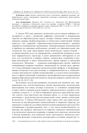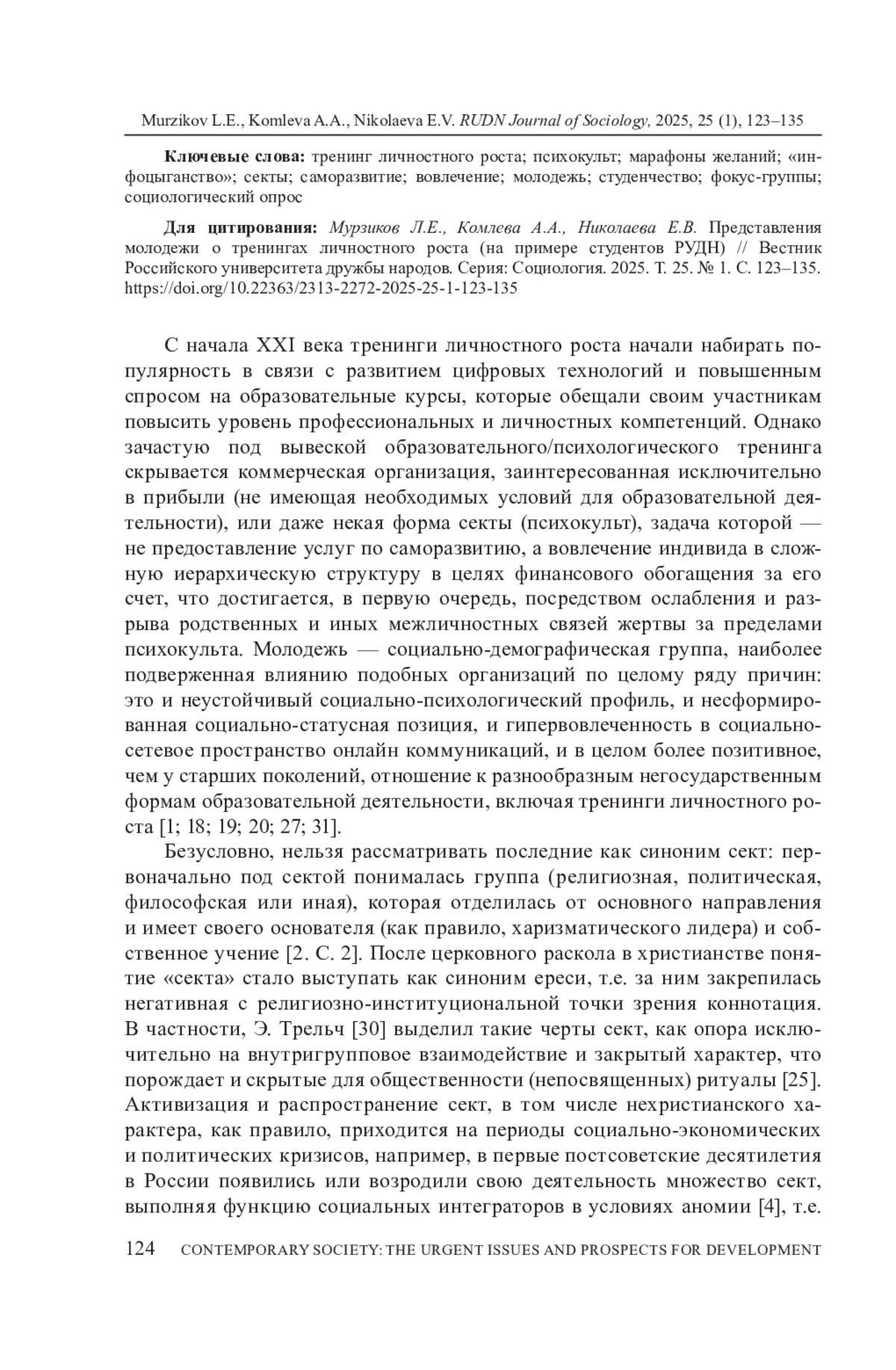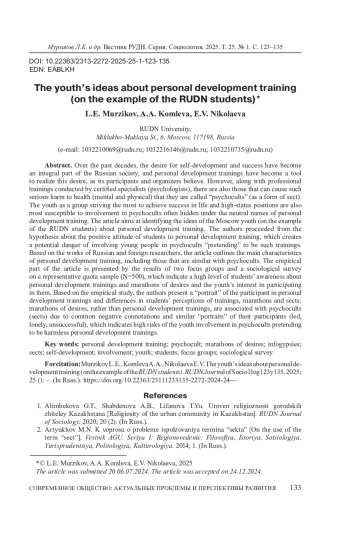 МУРЗИКОВ Л. Е., КОМЛЕВА А. А., НИКОЛАЕВА Е. В. ПРЕДСТАВЛЕНИЯ МОЛОДЕЖИ О ТРЕНИНГАХ ЛИЧНОСТНОГО РОСТА (НА ПРИМЕРЕ СТУДЕНТОВ РУДН) // ВЕСТНИК РОССИЙСКОГО УНИВЕРСИТЕТА ДРУЖБЫ НАРОДОВ. СЕРИЯ: СОЦИОЛОГИЯ. 2025. Т. 25 № 1