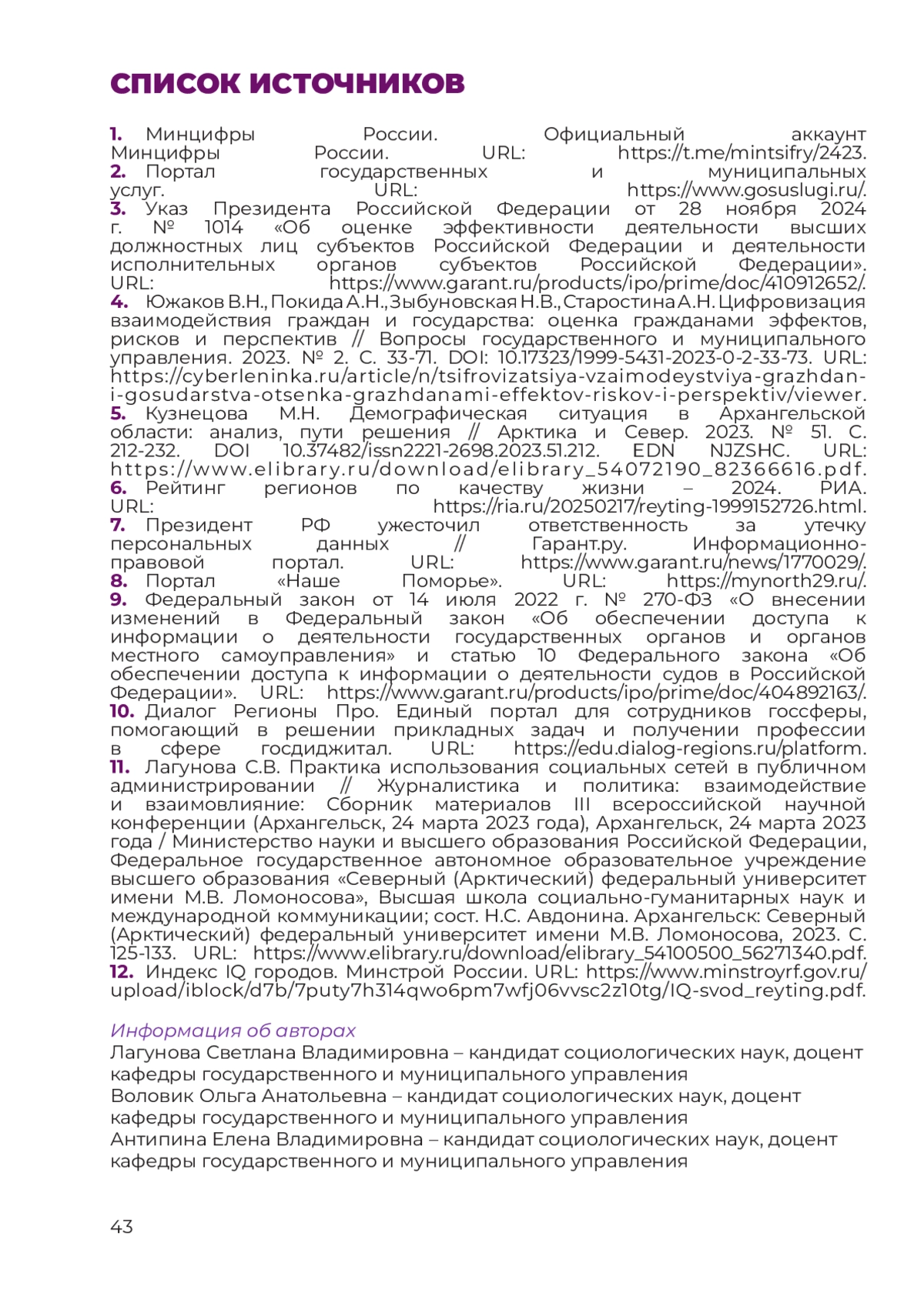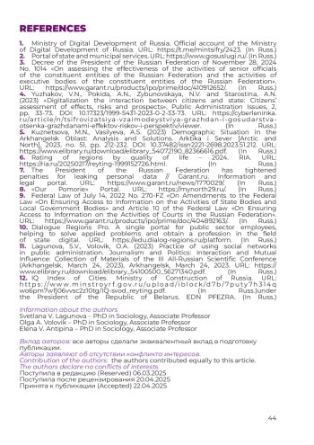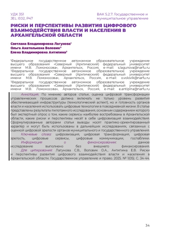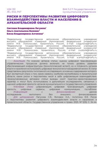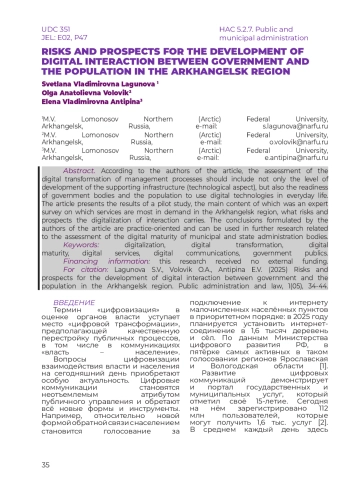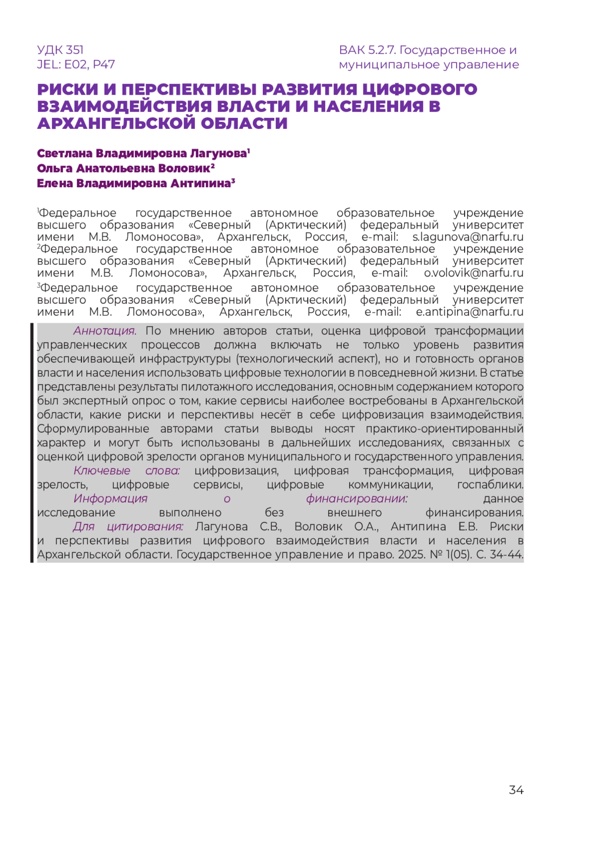 ЛАГУНОВА С. В., ВОЛОВИК О. А., АНТИПИНА Е. В. РИСКИ И ПЕРСПЕКТИВЫ РАЗВИТИЯ ЦИФРОВОГО ВЗАИМОДЕЙСТВИЯ ВЛАСТИ И НАСЕЛЕНИЯ В АРХАНГЕЛЬСКОЙ ОБЛАСТИ // НАУЧНЫЙ ЖУРНАЛ "ГОСУДАРСТВЕННОЕ УПРАВЛЕНИЕ И ПРАВО". 2025. № 1 (5)