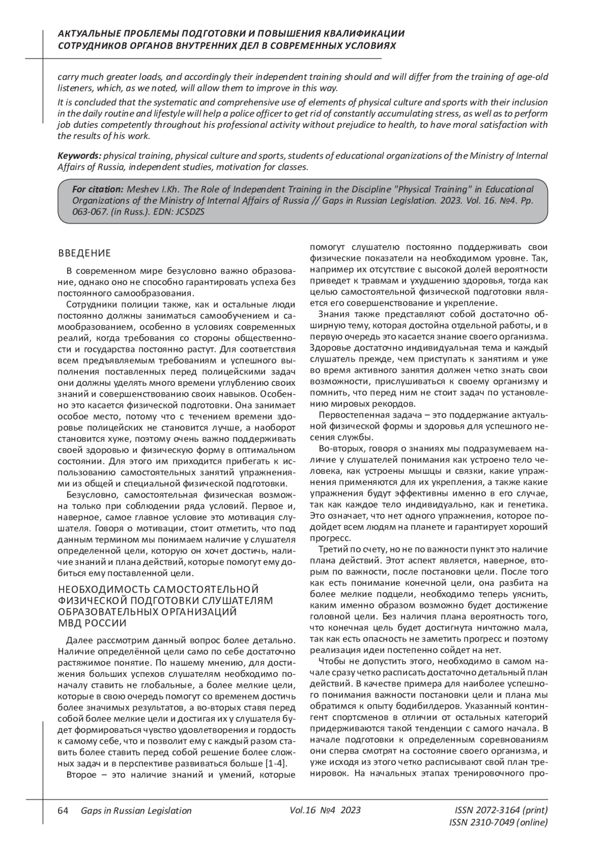 МЕШЕВ И. Х. РОЛЬ САМОСТОЯТЕЛЬНОЙ ПОДГОТОВКИ ПО ДИСЦИПЛИНЕ "ФИЗИЧЕСКАЯ ПОДГОТОВКА" В ОБРАЗОВАТЕЛЬНЫХ ОРГАНИЗАЦИЯХ МВД РОССИИ // ПРОБЕЛЫ В РОССИЙСКОМ ЗАКОНОДАТЕЛЬСТВЕ. 2023. Т. 16 № 4
