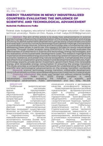 Целью данной статьи является изучение того, как достижения в области науки и техники влияют на реализацию энергетического перехода и энергоэффективности для глобального устойчивого развития на примере новых индустриальных стран. В настоящее время перед человечеством стоит важная глобальная задача – переход к устойчивым источникам энергии. Наука и техника играют основополагающую роль в решении этих проблем. В частности, исследование сосредоточено на новых индустриальных странах. С помощью кластерного анализа с использованием STATISTICA 12 исследование оценивает эффективность инвестиций в науку и технику, энергетические технологии и реализацию Целей устойчивого развития. Исследование подчёркивает важность возобновляемых источников энергии для сокращения выбросов углерода, повышения экономической устойчивости и сохранения природных экосистем. Оно подчёркивает ключевую роль грантов на техническое сотрудничество, расходов на исследования и разработки, экспорта высокотехнологичной продукции, инвестиций частного сектора, государственных потоков в возобновляемые источники энергии и потребления возобновляемой энергии в обеспечении энергетического перехода. Исследование предоставляет комплексную основу для понимания влияния научных и технологических достижений на энергетический переход в мире.
