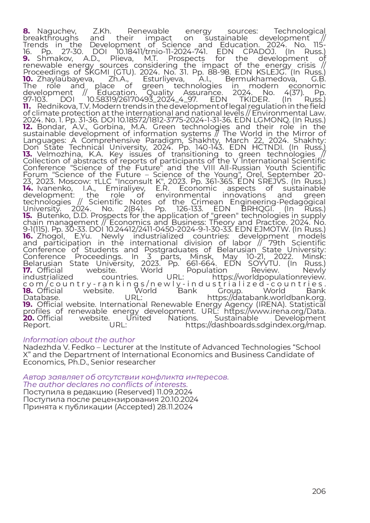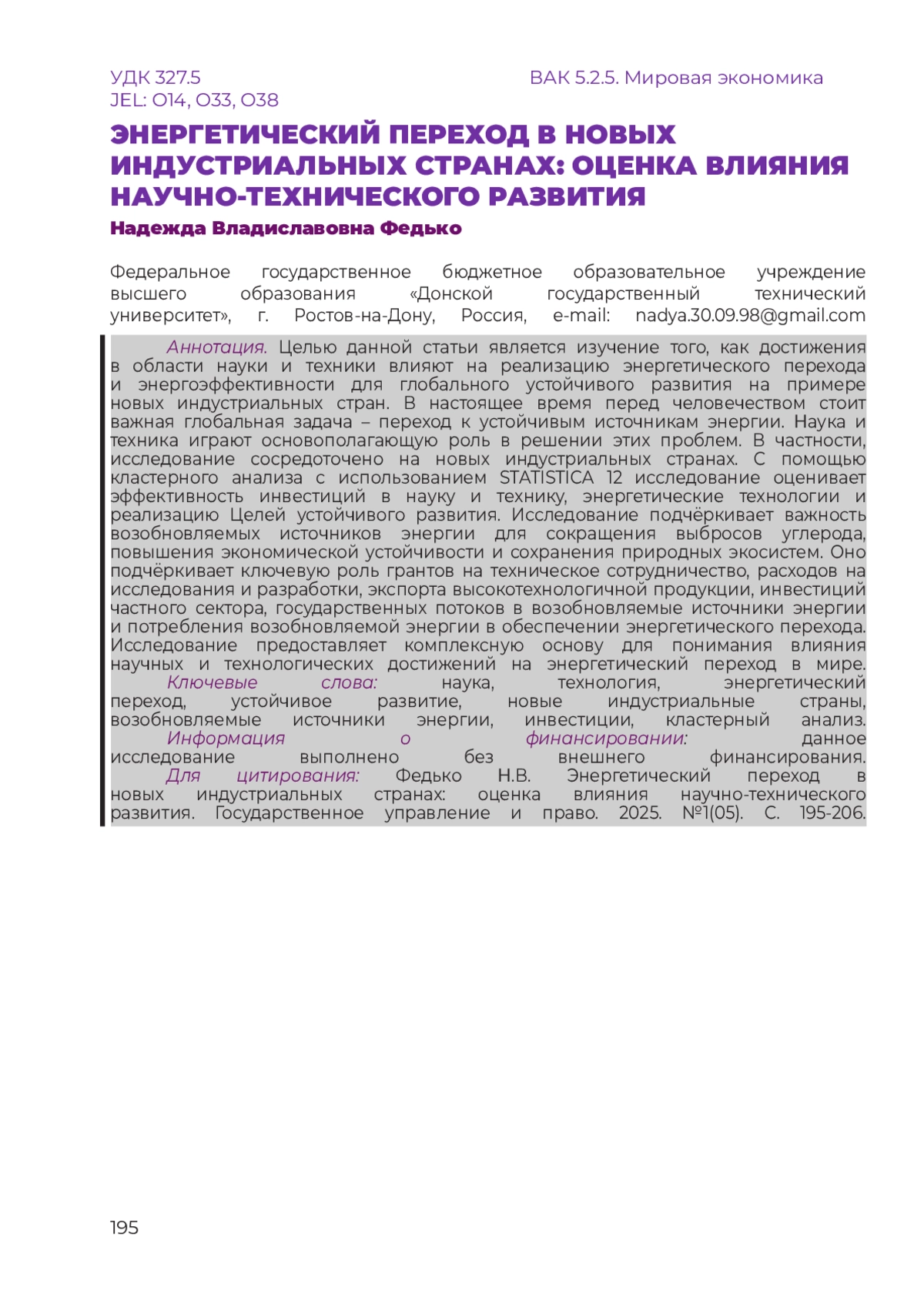 ФЕДЬКО Н. В. ЭНЕРГЕТИЧЕСКИЙ ПЕРЕХОД В НОВЫХ ИНДУСТРИАЛЬНЫХ СТРАНАХ: ОЦЕНКА ВЛИЯНИЯ НАУЧНО-ТЕХНИЧЕСКОГО РАЗВИТИЯ // НАУЧНЫЙ ЖУРНАЛ "ГОСУДАРСТВЕННОЕ УПРАВЛЕНИЕ И ПРАВО". 2025. № 1 (5)