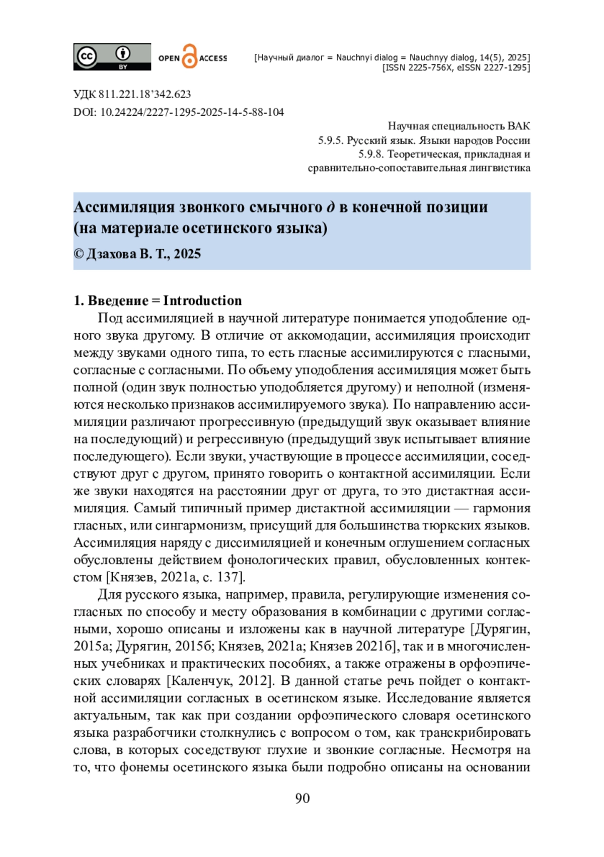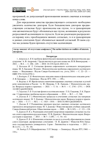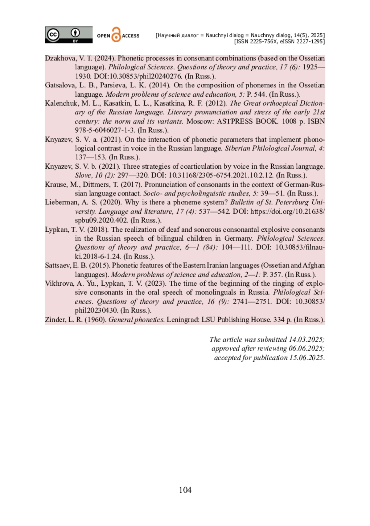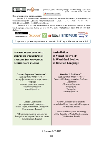 6. Дзахова В. Т. а Фонетические процессы в сочетаниях согласных (на материале осетинского языка) / В. Т. Дзахова // Филологические науки. Вопросы теории и практики. - 2024. - Т. 17. - № 6. - С. 1925-1930. - https://doi.org/10.30853/phil20240276.