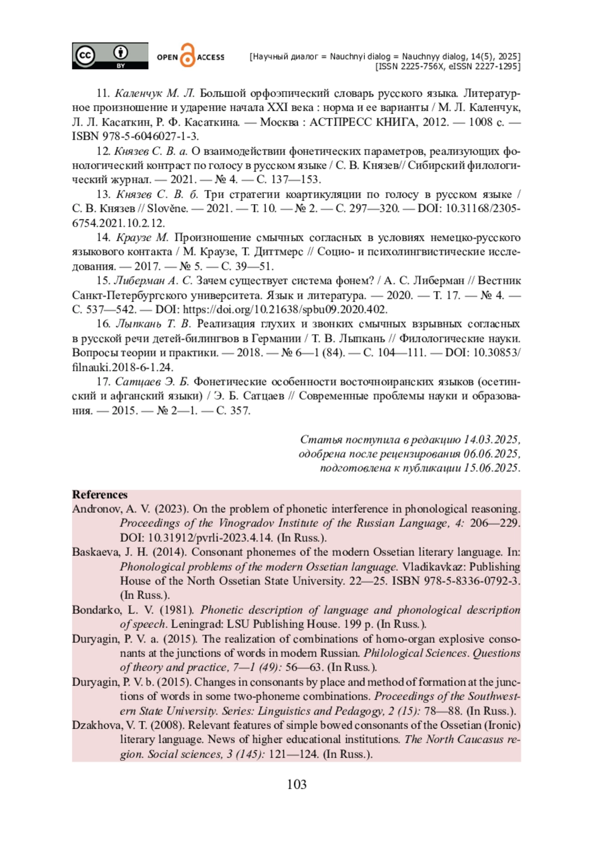 11. Князев С. В. а. О взаимодействии фонетических параметров, реализующих фонологический контраст по голосу в русском языке / С. В. Князев// Сибирский филологический журнал. - 2021. - № 4. - С. 137-153.