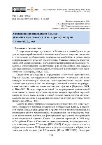 4. Кравченко Е. Ю. Итальянцы в Крыму : культурная память и национальная идентичность / Е. Ю. Кравченко // Культура и цивилизация. - 2017. - Т. 7. - № 5А. - С. 457-466.