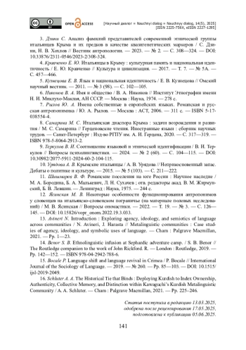 3. Дзини С. Анализ фамилий представителей современной этнической группы итальянцев Крыма и их предков в качестве квазигенетических маркеров / С. Дзини, Н. В. Хохлов // Вестник антропологии. - 2023. - № 2. - С. 308-324. - https://doi.org/10.33876/2311-0546/2023-2/308-324.
