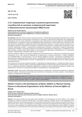 В данной статье изучены ключевые аспекты, способствующие развитию двигательных способностей у обучающегося контингента слушателей на занятиях по физической подготовке. Все современное образование так или иначе переходит к интеграции самих обучающихся в процесс обучения, взаимодействие преподавателя и слушателя, умение преподавателей прислушиваться к своим подопечным. Занятия по данной дисциплине проводятся в формате учебно-тренировочного процесса с учетом четкого регламента по проведению занятий. Современные тенденции в развитии двигательных способностей на занятиях по физической подготовке связаны с применением инновационных методик, технологий и средств тренировки. Современные подходы к занятиям все больше учитывают индивидуальные особенности и потребности каждого человека, ставят перед собой задачу не только развития физических способностей, но и укрепления здоровья и формирования здорового образа жизни в целом. Каждый сотрудник ОВД для выполнения профессиональной деятельности наделяется государством кругом полномочий. На их плечи ложится обязанность по укреплению и защите законности, а также поддержанию справедливости и защищенности, так как данная профессия связана с ситуациями экстремального и чрезвычайного содержания (применение оружия, освобождение заложников, обеспечение режима КТО и пр.), что оказывает непосредственное влияние на формирование личностно-профессиональных характеристик правоохранителей. Все изложенное отчетливо свидетельствует о необходимости формирования у сотрудников ОВД специальных двигательных навыков. Данные качества вырабатываются в процессе физической подготовки слушателей и их совершенствования необходимо добиваться в короткие сроки прохождения обучения. Процесс это трудоемкий и зависит от согласованной работы преподавателя и тренирующегося.