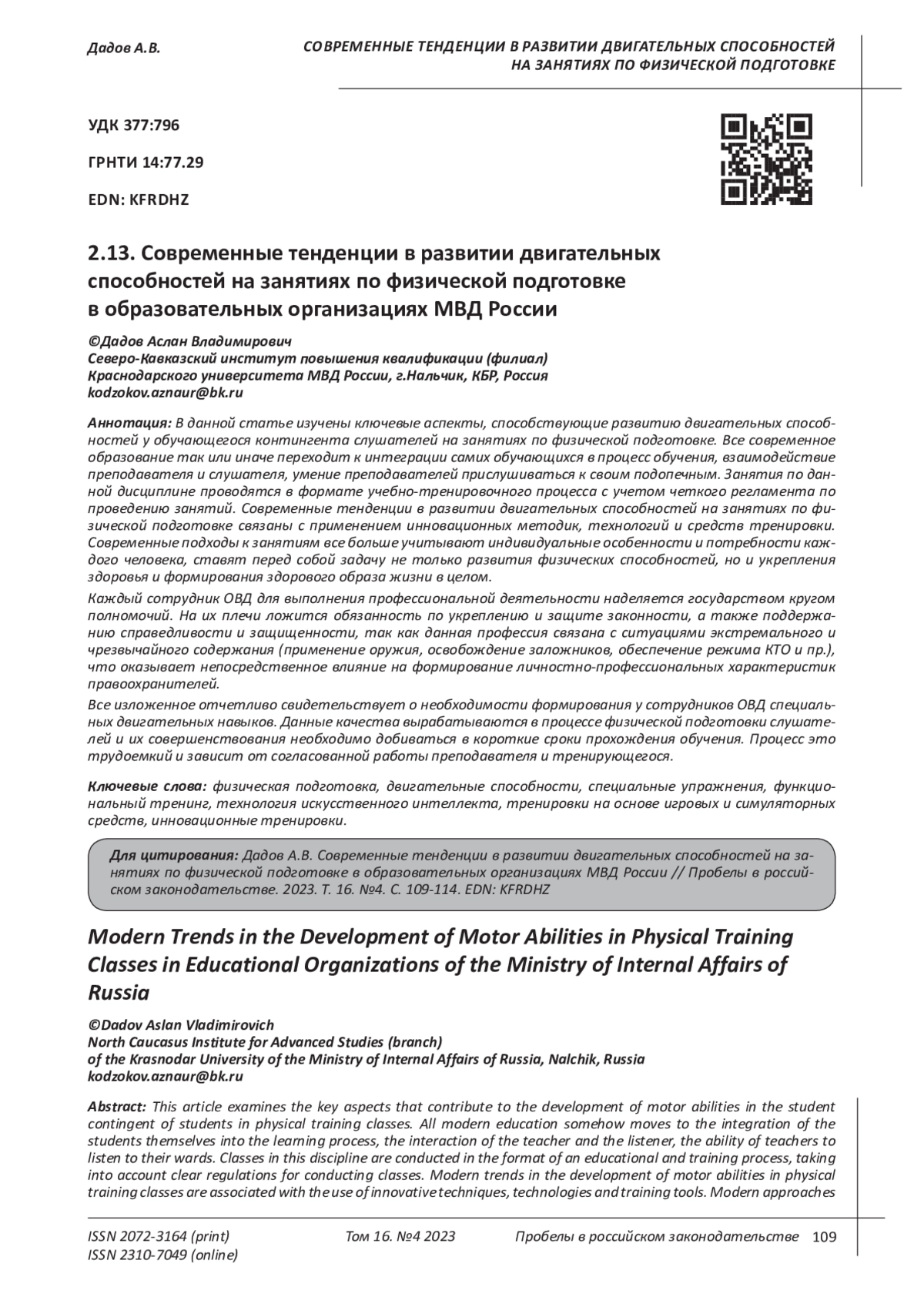 5. Кодзоков А.Х. Направленность физической подготовки сотрудников органов внутренних дел // Образование. Наука. Научные кадры. 2019. № 3. С. 146-148. EDN: IDHDDH