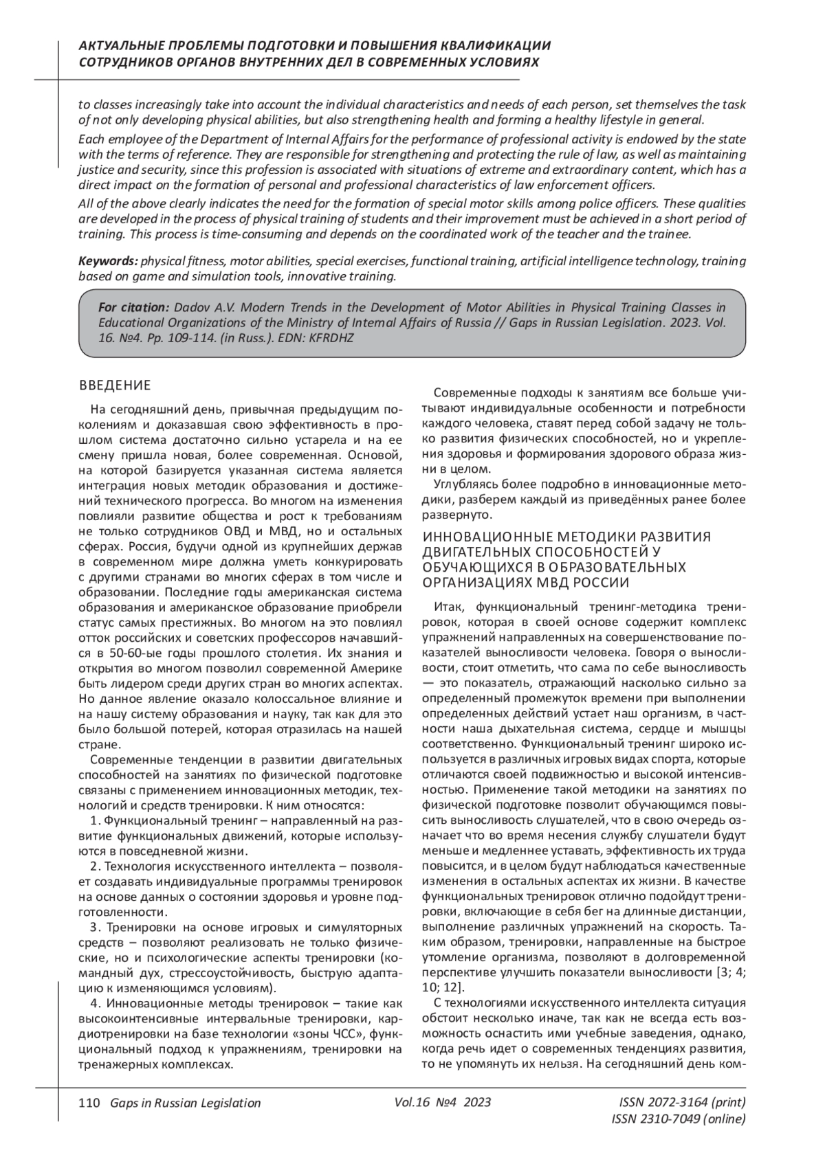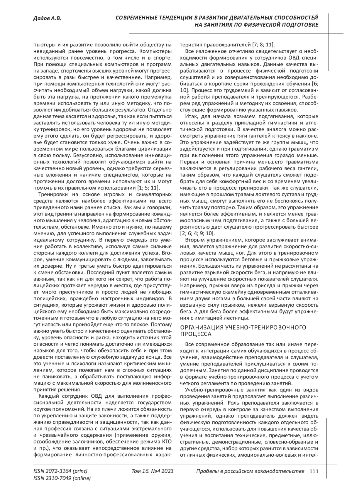10. Хажироков В.А. Организация и совершенствование навыков физической подготовки слушателей, обучающихся в вузах МВД России // Образование. Наука. Научные кадры. 2019. № 1. С. 203-205. EDN: VXELFO