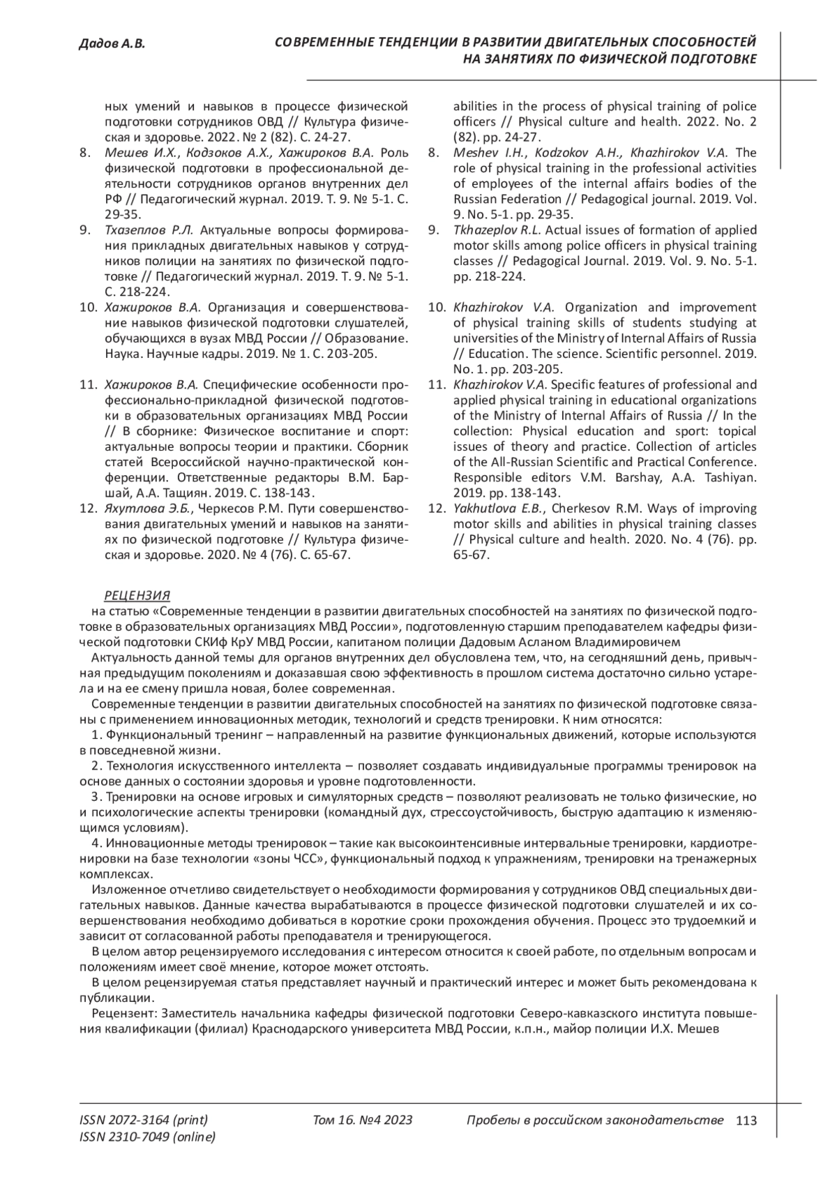8. Мешев И.Х., Кодзоков А.Х., Хажироков В.А. Роль физической подготовки в профессиональной деятельности сотрудников органов внутренних дел РФ // Педагогический журнал. 2019. Т. 9. № 5-1. С. 29-35. EDN: XAUEZU