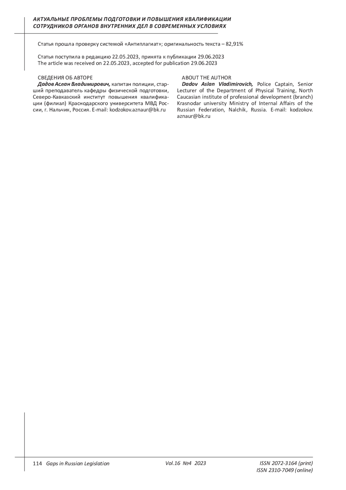 1. Бауаев Ш.Х. Методика формирования специальных двигательных умений и навыков в процессе физической подготовки сотрудников ОВД // Пробелы в российском законодательстве. 2022. Т. 15. № 5. С. 47-51. EDN: JGEAJT