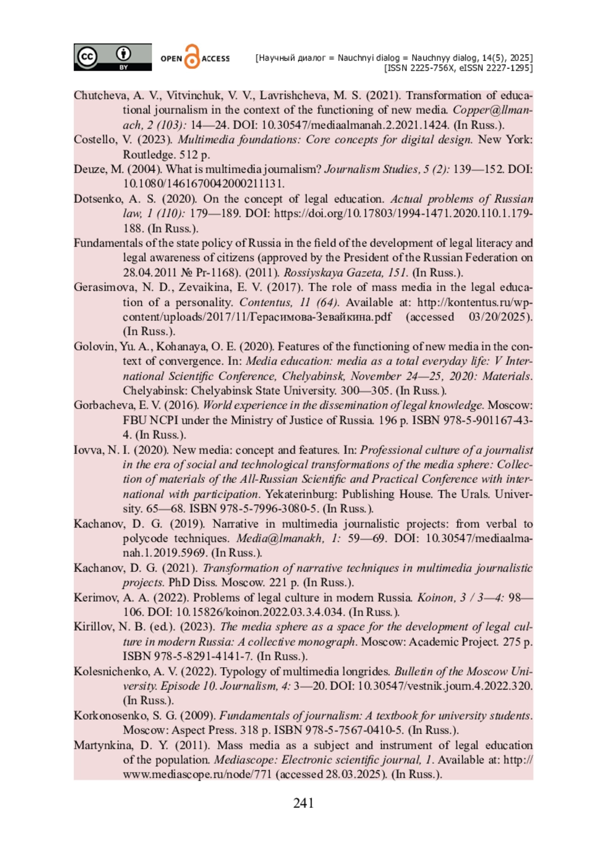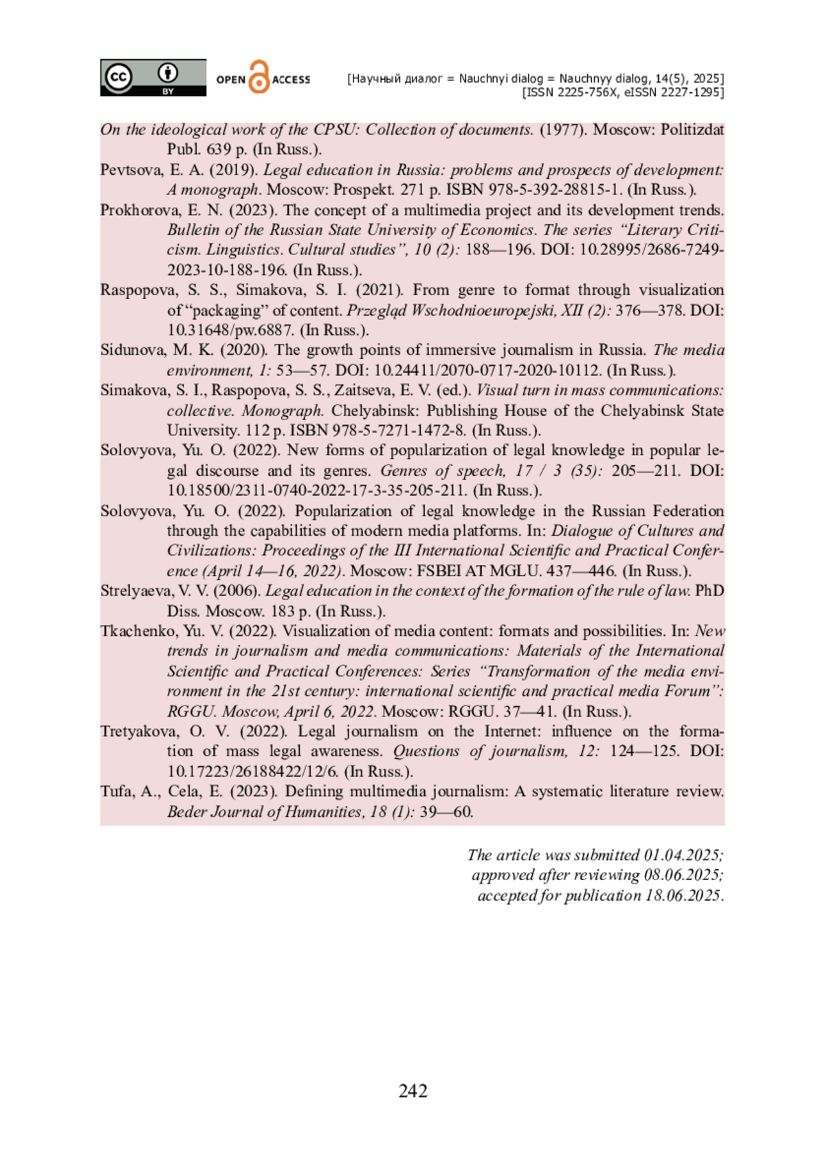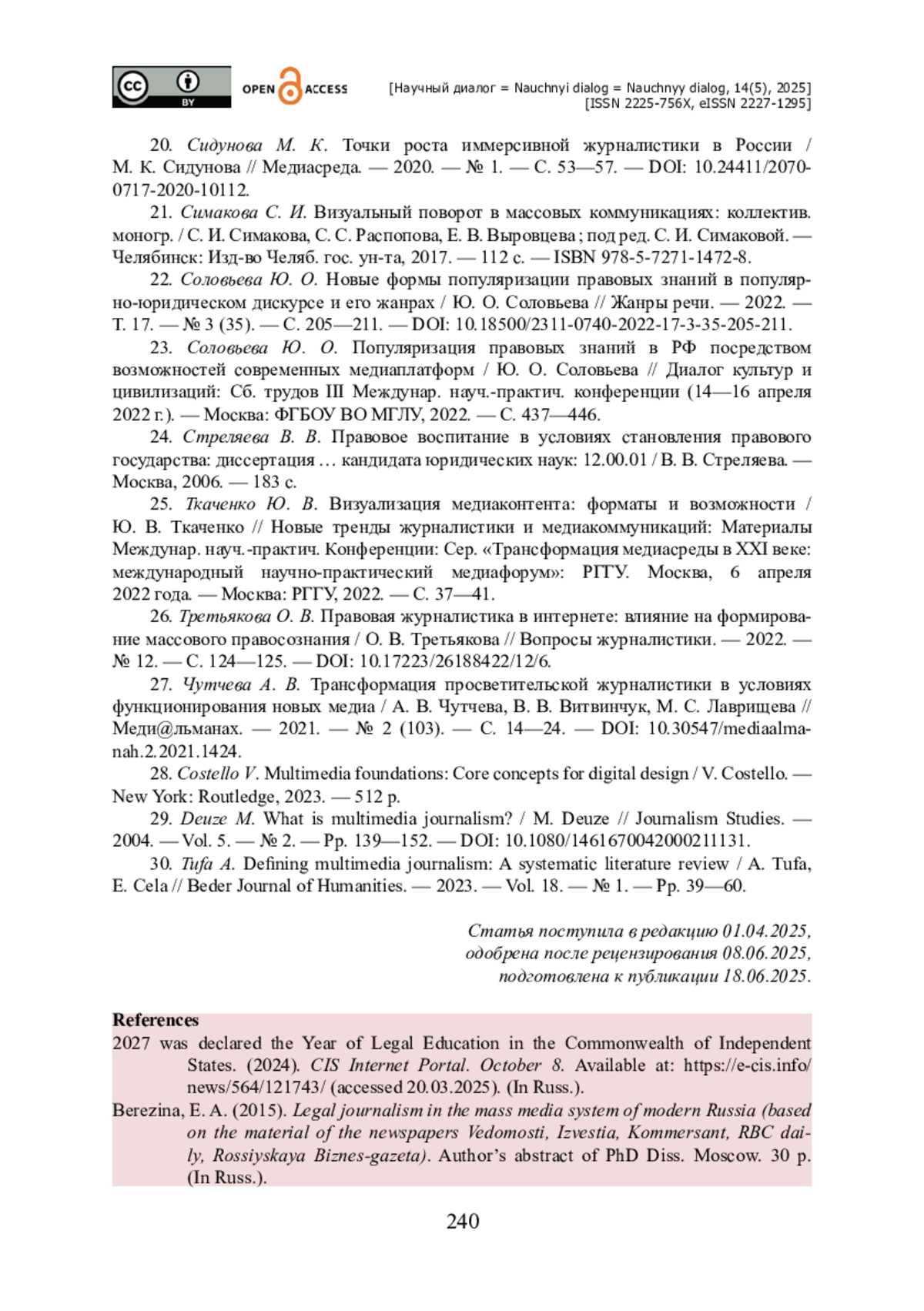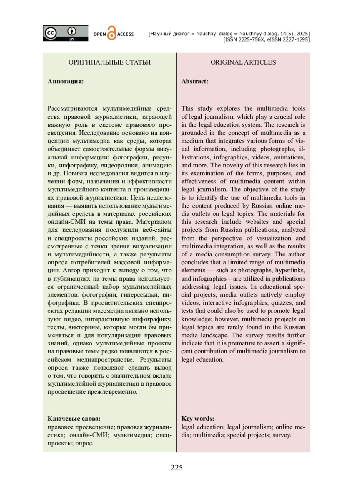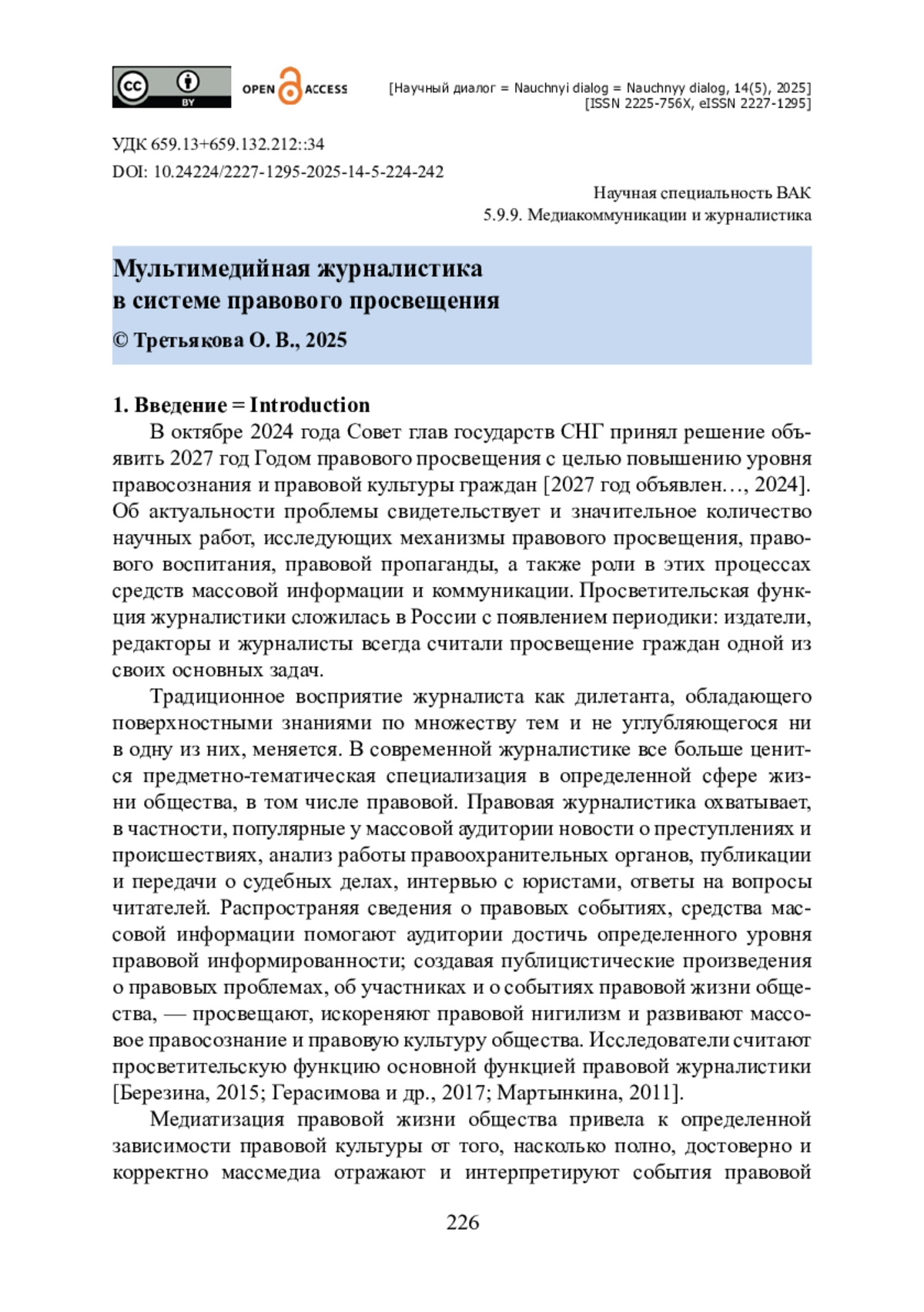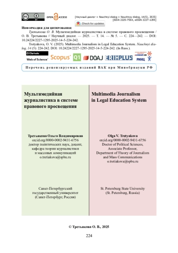 ТРЕТЬЯКОВА О. В. МУЛЬТИМЕДИЙНАЯ ЖУРНАЛИСТИКА В СИСТЕМЕ ПРАВОВОГО ПРОСВЕЩЕНИЯ // НАУЧНЫЙ ДИАЛОГ. 2025. ТОМ 14, № 5