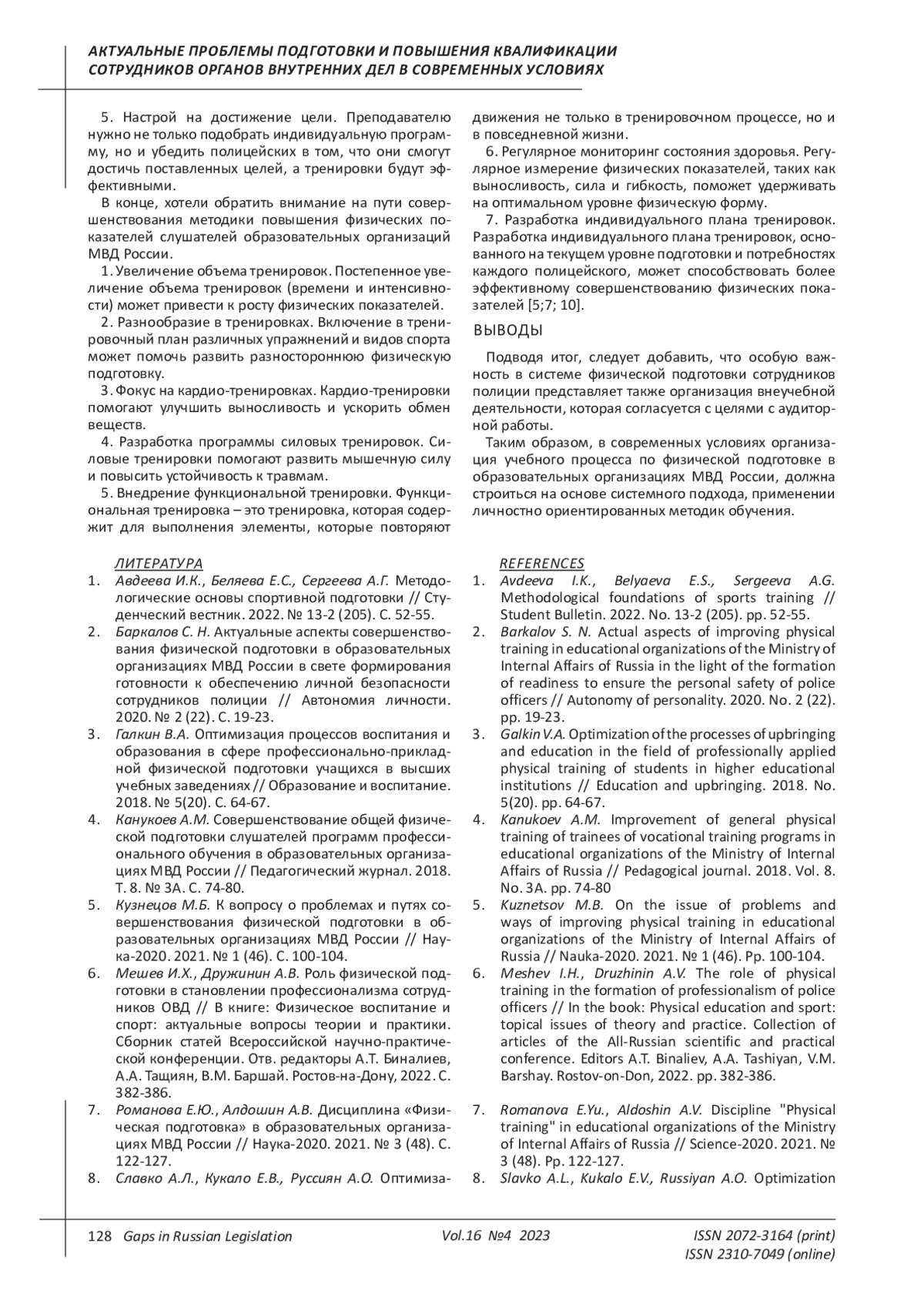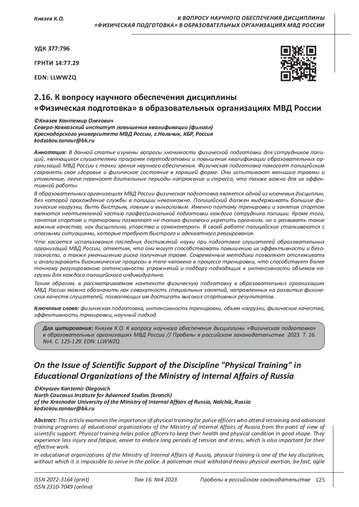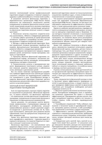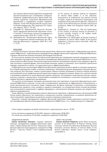 Статья: К ВОПРОСУ НАУЧНОГО ОБЕСПЕЧЕНИЯ ДИСЦИПЛИНЫ "ФИЗИЧЕСКАЯ ПОДГОТОВКА" В ОБРАЗОВАТЕЛЬНЫХ ОРГАНИЗАЦИЯХ МВД РОССИИ (2023)