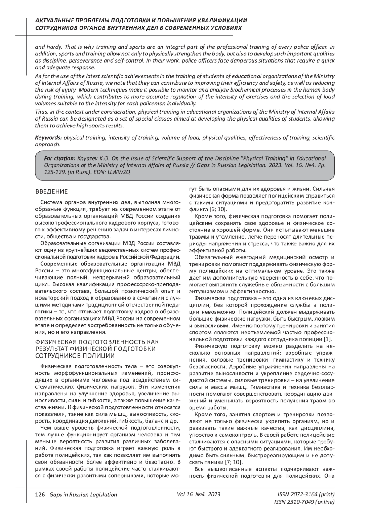 В данной статье изучены вопросы значимости физической подготовки для сотрудников полиций, являющихся слушателями программ переподготовки и повышения квалификации образовательных организаций МВД России с точки зрения научного обеспечения. Физическая подготовка помогает полицейским сохранять свое здоровье и физическое состояние в хорошей форме. Они испытывают меньшие травмы и утомление, легче переносят длительные периоды напряжения и стресса, что также важно для их эффективной работы. В образовательных организациях МВД России физическая подготовка является одной из ключевых дисциплин, без которой прохождение службы в полиции невозможно. Полицейский должен выдерживать большие физические нагрузки, быть быстрым, ловким и выносливым. Именно поэтому тренировки и занятия спортом являются неотъемлемой частью профессиональной подготовки каждого сотрудника полиции. Кроме того, занятия спортом и тренировки позволяют не только физически укрепить организм, но и развивать такие важные качества, как дисциплина, упорство и самоконтроль. В своей работе полицейские сталкиваются с опасными ситуациями, которые требуют быстрого и адекватного реагирования. Что касается использования последних достижений науки при подготовке слушателей образовательных организаций МВД России, отметим, что они могут способствовать повышению их эффективности и безопасности, а также уменьшению риска получения травм. Современные методики позволяют отслеживать и анализировать биохимические процессы в теле человека в процессе тренировки, что способствует более точному регулированию интенсивности упражнений и подбору подходящих к интенсивности объемов нагрузки для каждого полицейского индивидуально. Таким образом, в рассматриваемом контексте физическую подготовку в образовательных организациях МВД России можно обозначить как совокупность специальных занятий, направленных на развитие физических качеств слушателей, позволяющих им достигать высоких спортивных результатов.