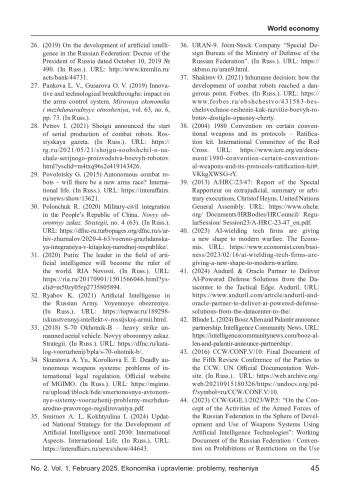 44. CCW/GGE.1/2023/WP.5: “О Концепции деятельности Вооруженных Сил Российской Федерации в сфере разработки и применения систем вооружений с использованием технологий искусственного интеллекта”: Рабочий документ Российской Федерации / Конвенция о запрещении или ограничении применения конкретных видов обычного оружия, которые могут считаться наносящими чрезмерные повреждения или имеющими неизбирательное действие: Материалы заседаний Группы правительственных экспертов по новым технологиям в сфере создания смертоносных автономных систем вооружений, Женева, 6-10 марта и 15-19 мая 2023 г. URL: https://docs-library.unoda.org/Convention_on_Certain_Conventional_Weapons_-Group_of_Governmental_Experts_on_Lethal_Autonomous_Weapons_Systems_(2023)/CCW_GGE1_2023_WP.5_0.pdf.