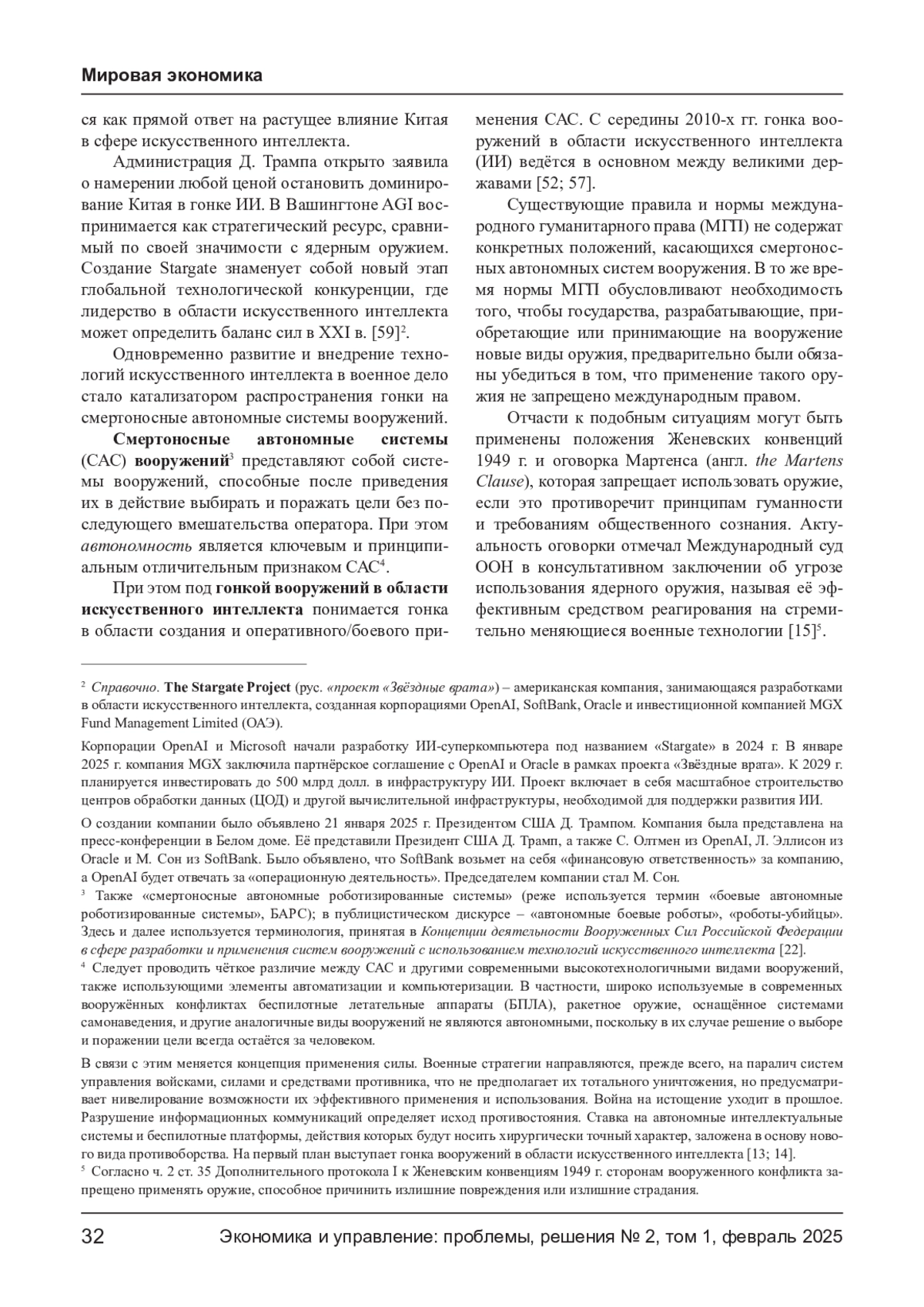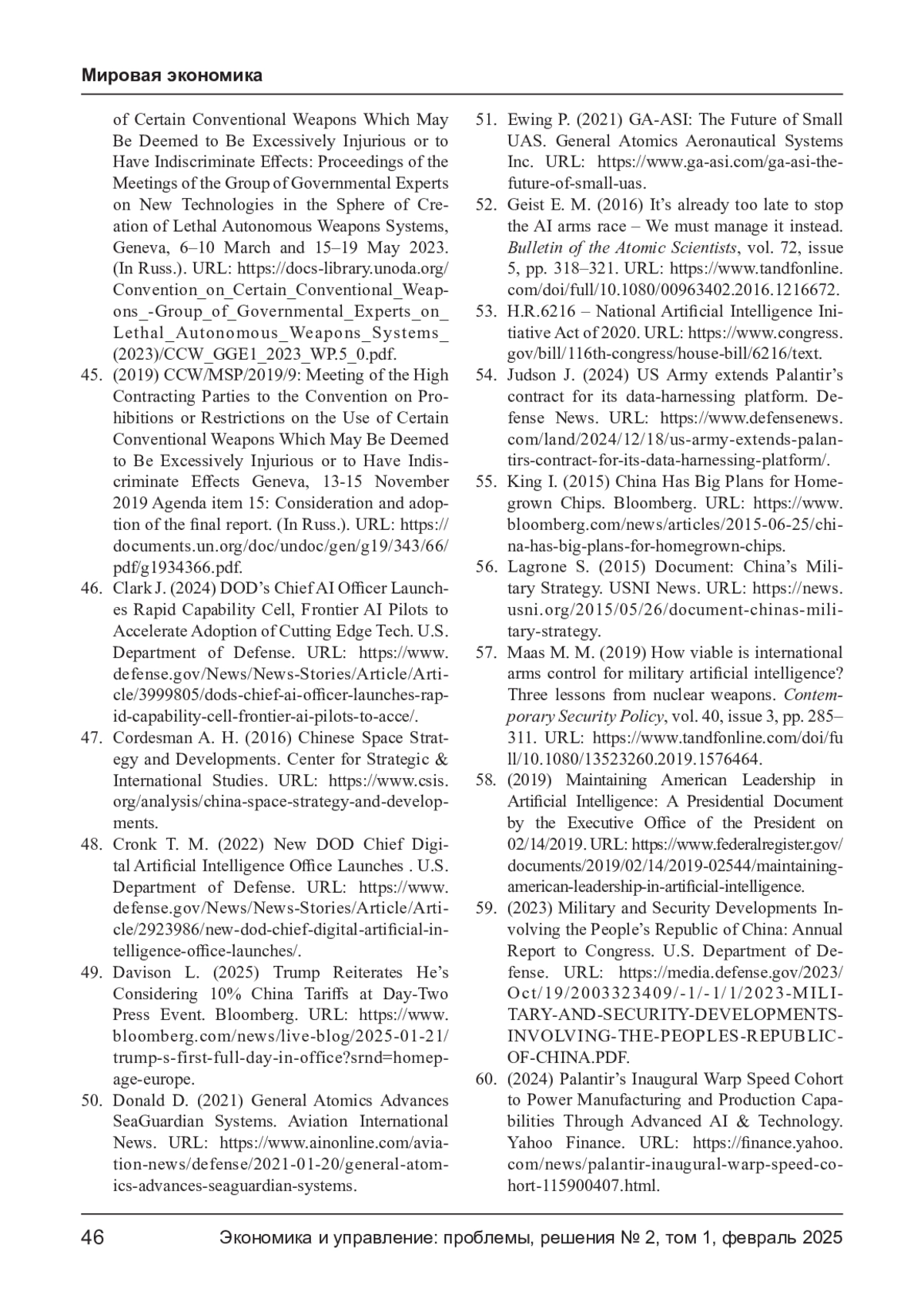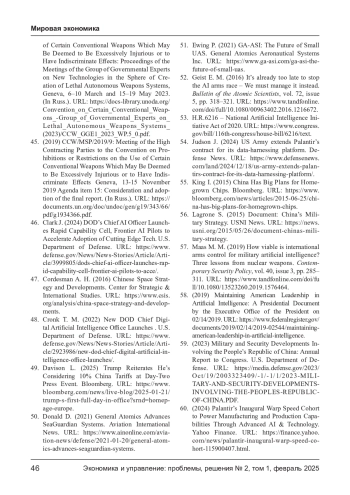 13. Гордиенко Д. В. Смертоносные автономные системы США, Китая и России. Гонка вооружений с использованием искусственного интеллекта (Часть 1. Разработка смертоносных автономных систем вооружения США) // Экономика и управление: проблемы, решения. 2025. Т. 1 (154), № 1. С. 84-101.