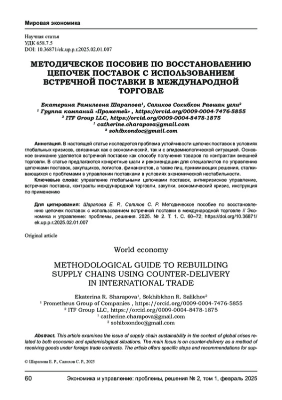 В настоящей статье исследуется проблема устойчивости цепочек поставок в условиях глобальных кризисов, связанных как с экономический, так и с эпидемиологической ситуацией. Основное внимание уделяется встречной поставке как способу получения товаров по контрактам внешней торговли. В статье предлагаются конкретные шаги и рекомендации для специалистов по управлению цепочками поставок, закупщиков, логистов, финансистов, а также лиц, принимающих решения, сталкивающихся с проблемами в управлении поставками в условиях экономической нестабильности.