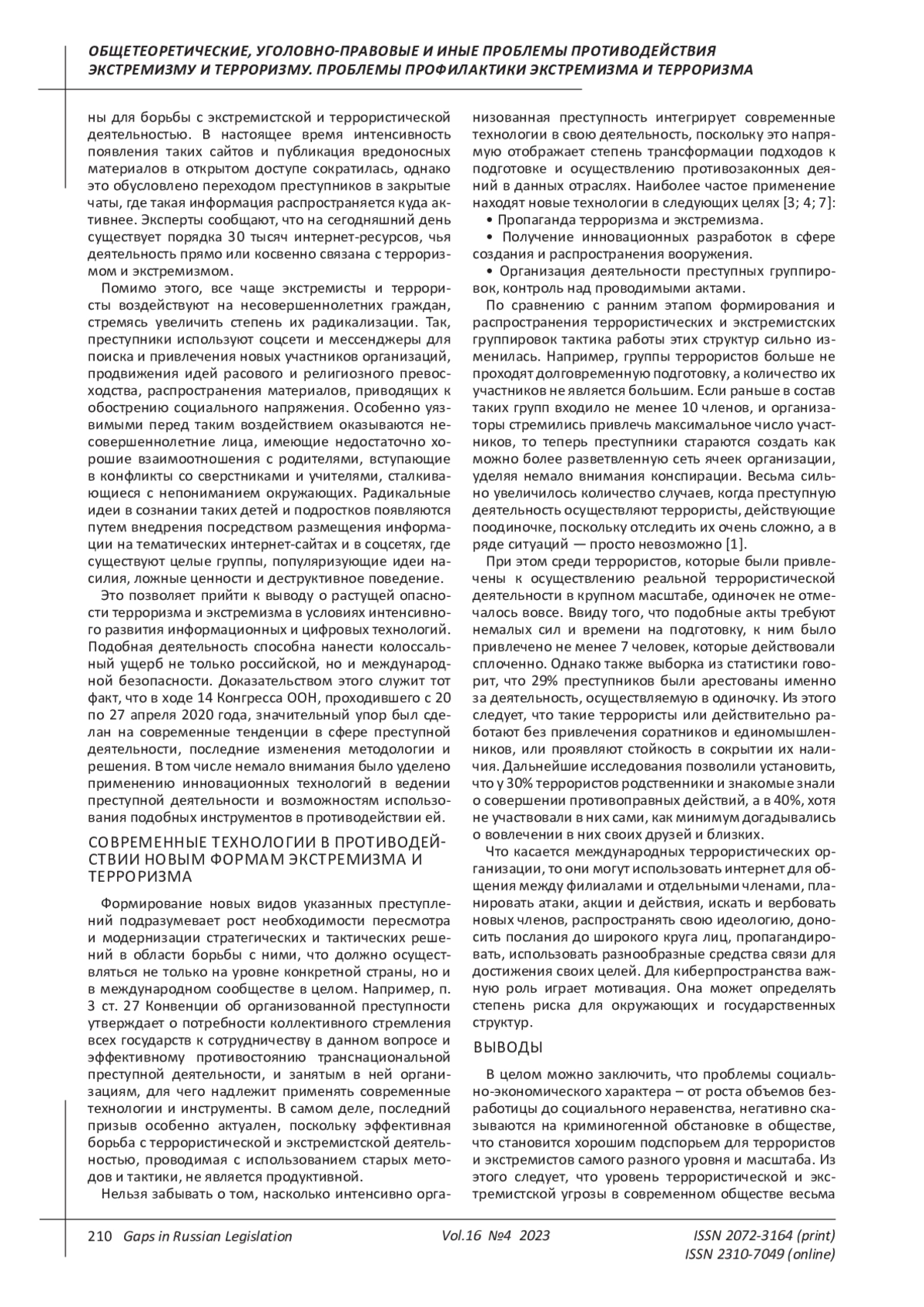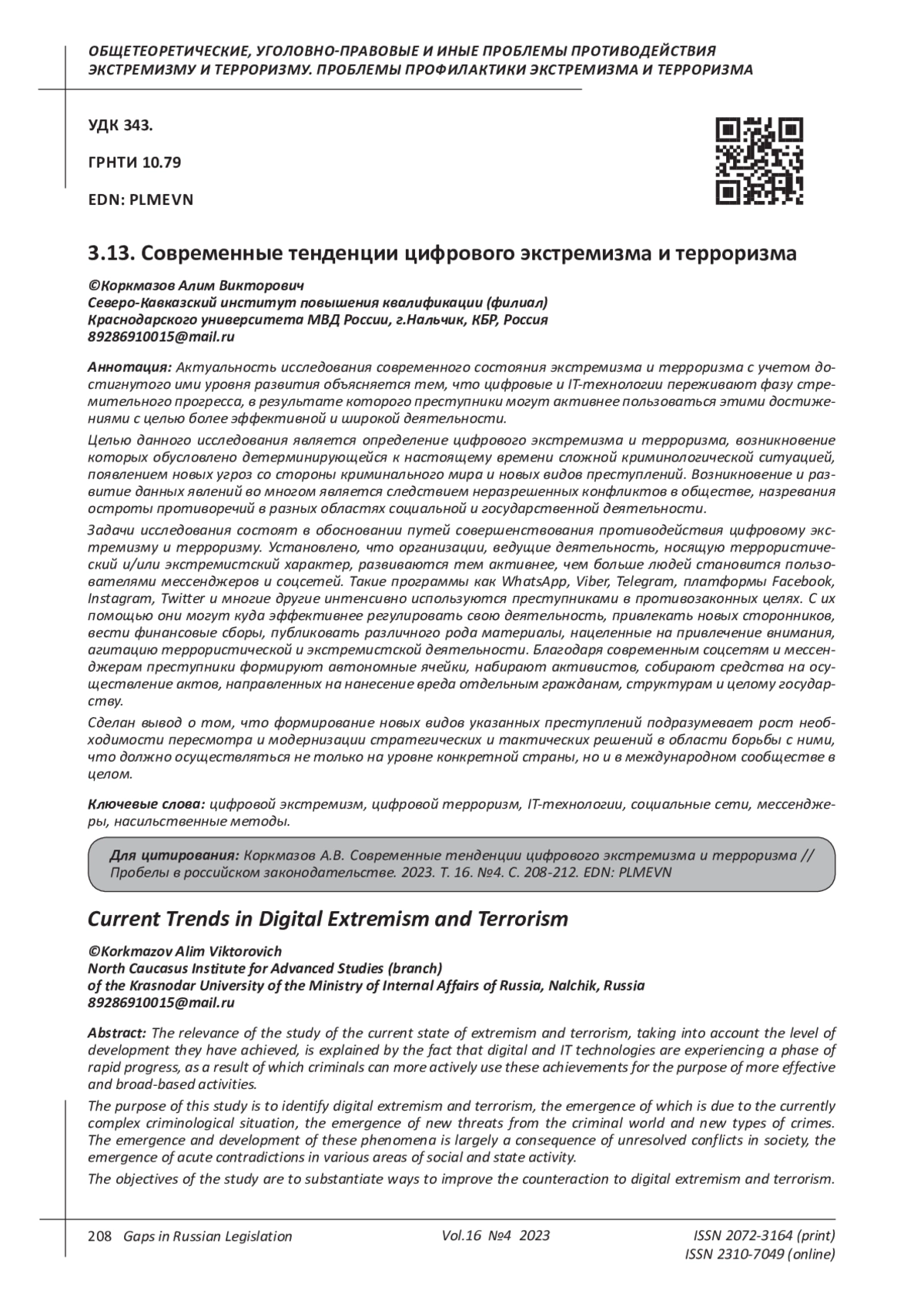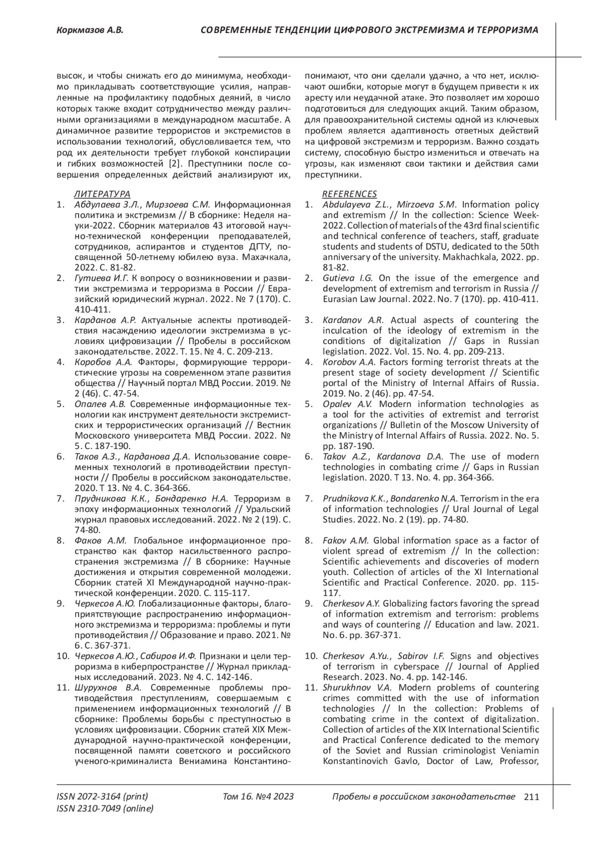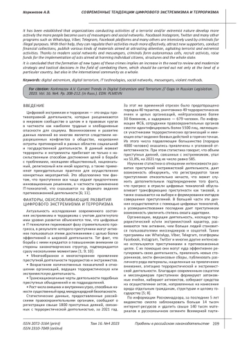 КОРКМАЗОВ А. В. СОВРЕМЕННЫЕ ТЕНДЕНЦИИ ЦИФРОВОГО ЭКСТРЕМИЗМА И ТЕРРОРИЗМА // ПРОБЕЛЫ В РОССИЙСКОМ ЗАКОНОДАТЕЛЬСТВЕ. 2023. Т. 16 № 4