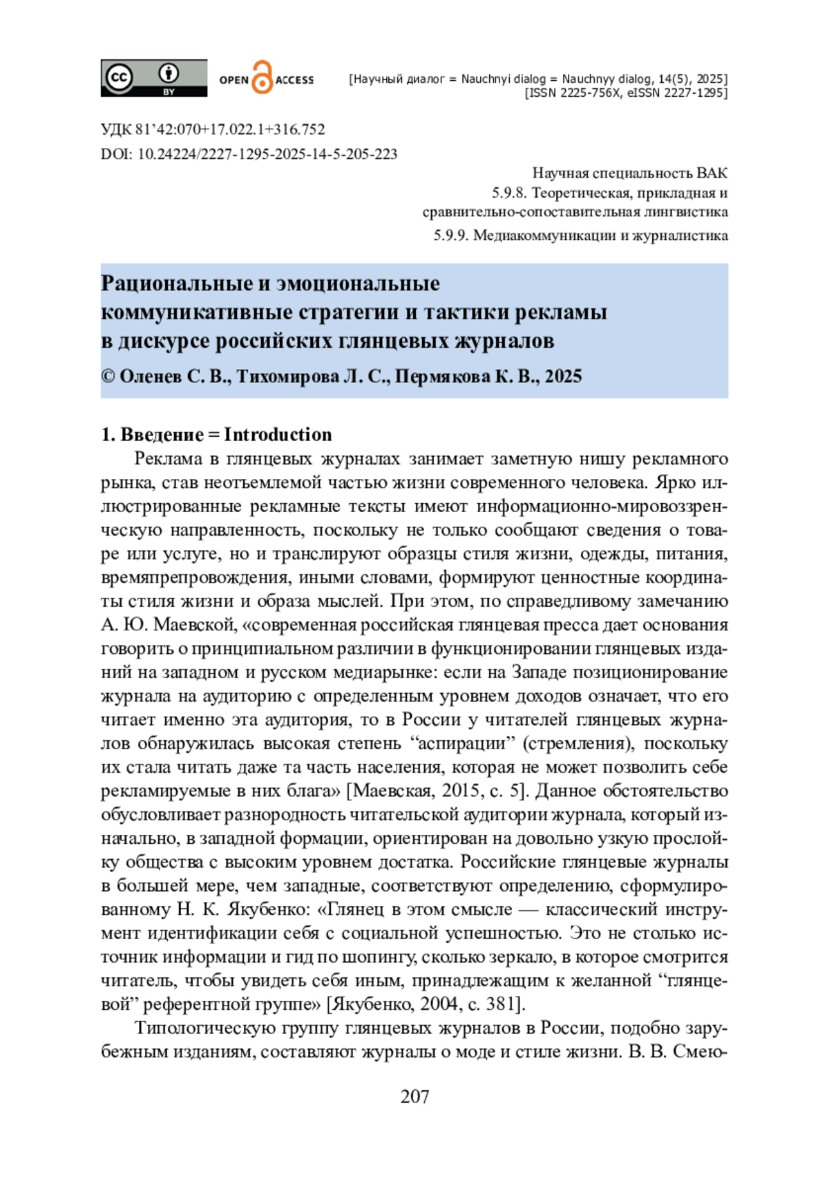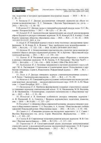 1. Бакалова Е. В. Переключения кодов в дискурсе глянцевых журналов: взаимосвязь структуры и прагматики / Е. В. Бакалова // Вестник ЮУрГУ. Серия: Лингвистика. - 2023. - № 2. - С. 62-68. - https://doi.org/10.14529/ling230209.