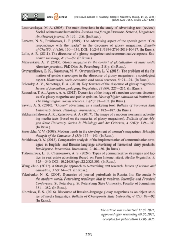 13. Лазеева Н. В. Рекламный аспект речевого жанра «Переписка с читателем» в дискурсе глянцевых журналов / Н. В. Лазеева, Л. П. Прохорова // Вестник ЧелГУ. - 2019. - № 4 (426). - С. 130-136. - https://doi.org/10.24411/1994-2796-2019-10417.