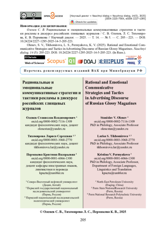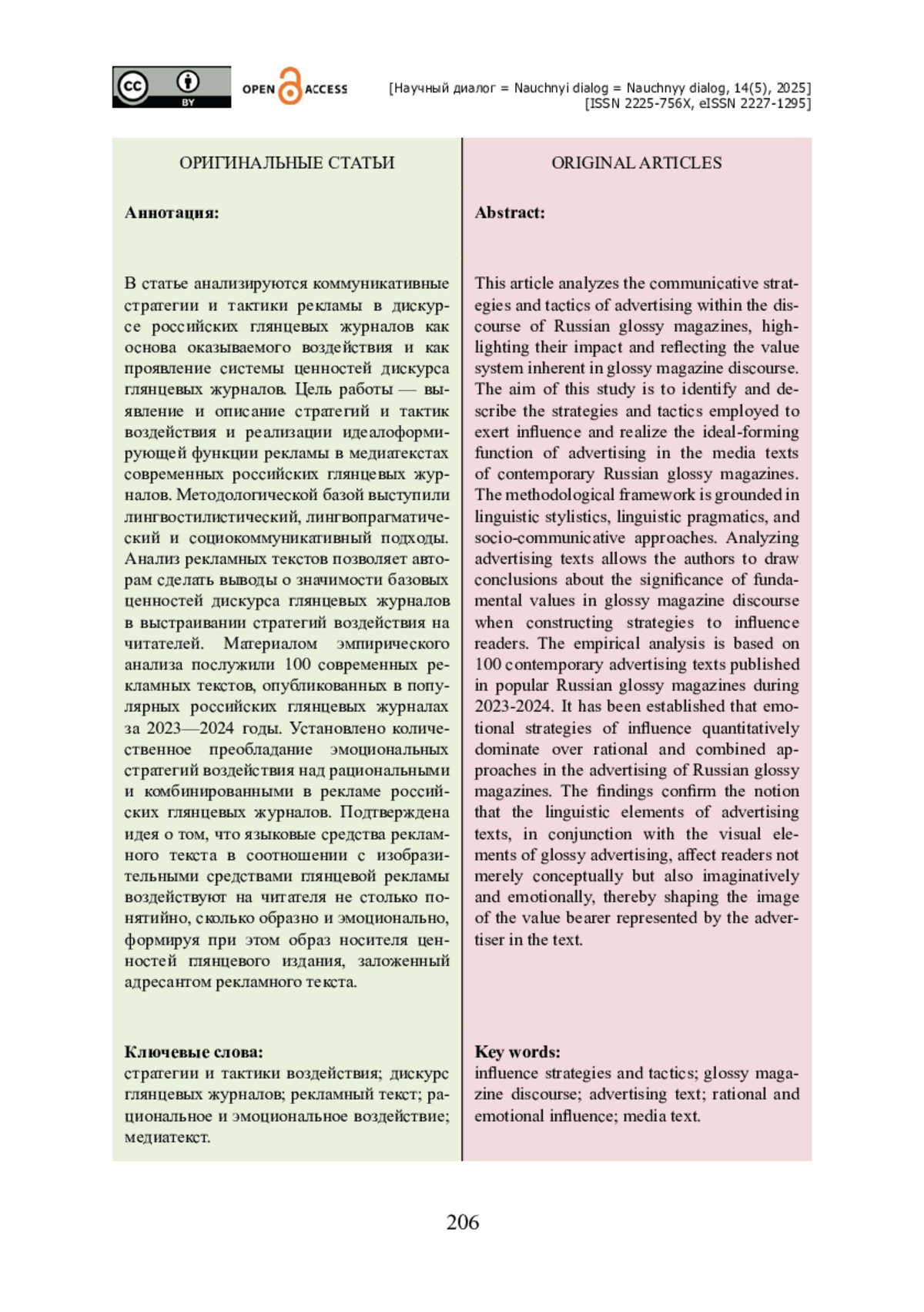 В статье анализируются коммуникативные стратегии и тактики рекламы в дискурсе российских глянцевых журналов как основа оказываемого воздействия и как проявление системы ценностей дискурса глянцевых журналов. Цель работы — выявление и описание стратегий и тактик воздействия и реализации идеалоформирующей функции рекламы в медиатекстах современных российских глянцевых журналов. Методологической базой выступили лингвостилистический, лингвопрагматический и социокоммуникативный подходы. Анализ рекламных текстов позволяет авторам сделать выводы о значимости базовых ценностей дискурса глянцевых журналов в выстраивании стратегий воздействия на читателей. Материалом эмпирического анализа послужили 100 современных рекламных текстов, опубликованных в популярных российских глянцевых журналах за 2023—2024 годы. Установлено количественное преобладание эмоциональных стратегий воздействия над рациональными и комбинированными в рекламе российских глянцевых журналов. Подтверждена идея о том, что языковые средства рекламного текста в соотношении с изобразительными средствами глянцевой рекламы воздействуют на читателя не столько понятийно, сколько образно и эмоционально, формируя при этом образ носителя ценностей глянцевого издания, заложенный адресантом рекламного текста.