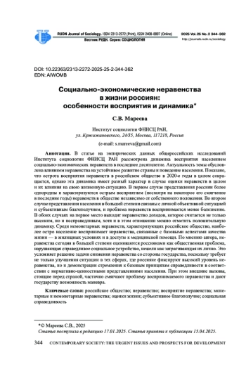 В статье на эмпирических данных общероссийских исследований Института социологии ФНИСЦ РАН рассмотрена динамика восприятия населением социально-экономических неравенств в последнее десятилетие. Актуальность темы обусловлена влиянием неравенства на устойчивое развитие страны и поведение населения. Показано, что острота восприятия неравенств в российском обществе в 2020-е годы в целом сокращается, однако эта динамика имеет разный характер в случае оценки неравенств в целом и их влияния на свою жизненную ситуацию. В первом случае представления россиян более однородны и характеризуются острым восприятием (несмотря на некоторое его смягчение в последние годы) неравенств в обществе независимо от собственного положения. Во втором случае представления населения в большей степени связаны с личной объективной ситуацией и субъективным благополучием, и проблема неравенств воспринимается менее болезненно. В обоих случаях на первое место выходит неравенство доходов, которое считается не только высоким, но и несправедливым, хотя и в этом отношении можно отметить положительную динамику. Среди немонетарных неравенств, характеризующих российское общество, наиболее остро население воспринимает неравенства, связанные с базовыми аспектами качества жизни - в жилищных условиях и в доступе к медицинской помощи. По мнению автора, неравенства сегодня в большей степени оцениваются россиянами как общественная проблема, нарушающая справедливое социальное устройство, нежели как затрагивающая их лично. Это усложняет решение задачи снижения неравенства со стороны государства, поскольку требует не только улучшения ситуации в тех сферах, где россияне фиксируют высокий уровень неравенства, но и демонстрации стремления к базовым принципам справедливости в соответствии с нормативно-ценностными представлениями населения. При этом внешние вызовы, стоящие перед страной, частично смягчают проблему воспринимаемого неравенства и дают государству возможность маневра.