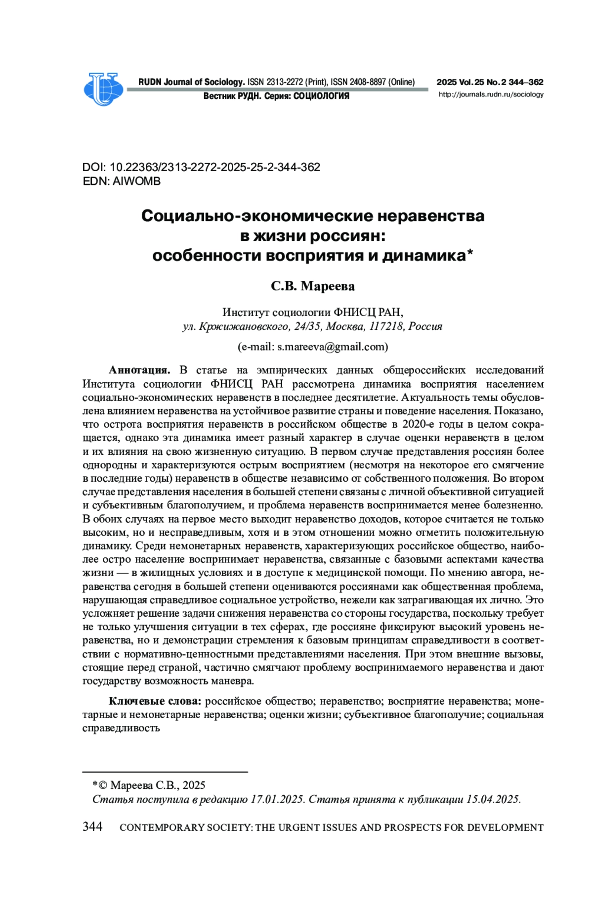 6. Мареева С.В., Каравай А.В., Слободенюк Е.Д. Представления о неравенстве как фактор инвестиций в человеческий капитал: опыт эмпирического анализа // Социологические исследования. 2023. № 6.
