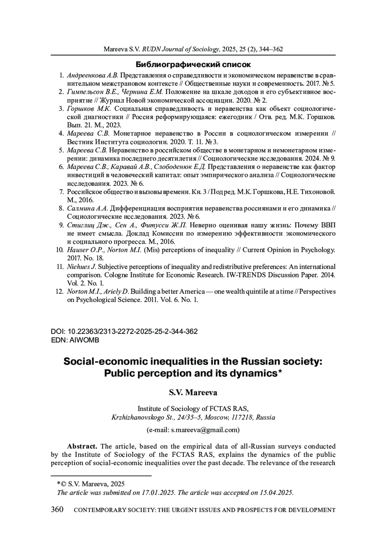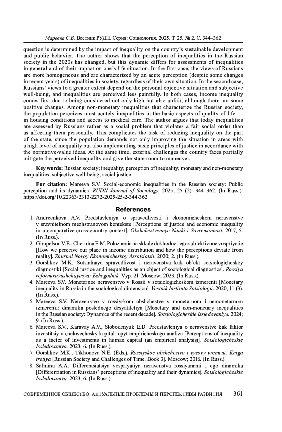 1. Андреенкова А.В. Представления о справедливости и экономическом неравенстве в сравнительном межстрановом контексте // Общественные науки и современность. 2017. № 5.